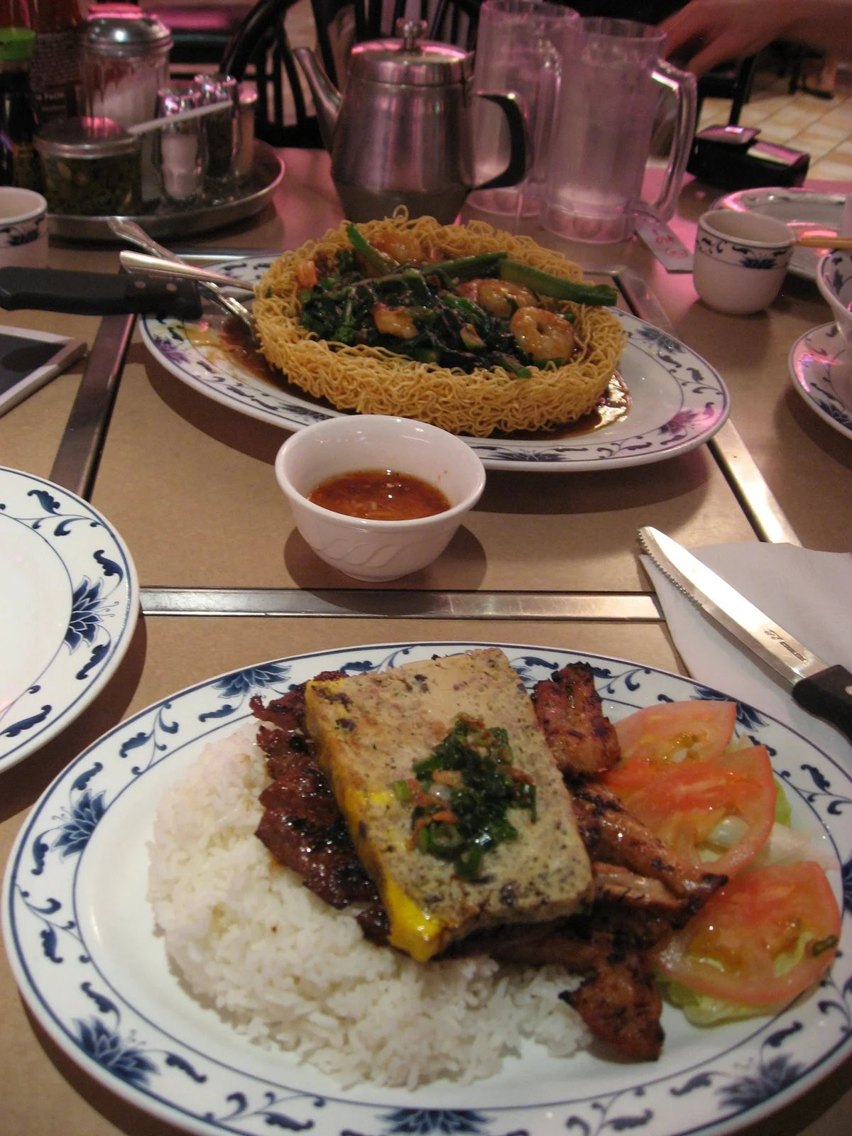 The following day, we stuffed ourselves with the hotel breakfast, had some Kashi bars and wasabi peas in the parking lot of Space Center Houston, then went to Tan Tan restaurant on Bellaire Blvd. We chose it just because we saw a lot of cars in its parking lot; that turned out to be an effective strategy because the food was excellent! I had Vietnamese barbeque, where pork and chicken were super tender and flavorful. And shared a kailan and shrimp liang mian huang, which unlike most renditions was not overly gooey or salty.