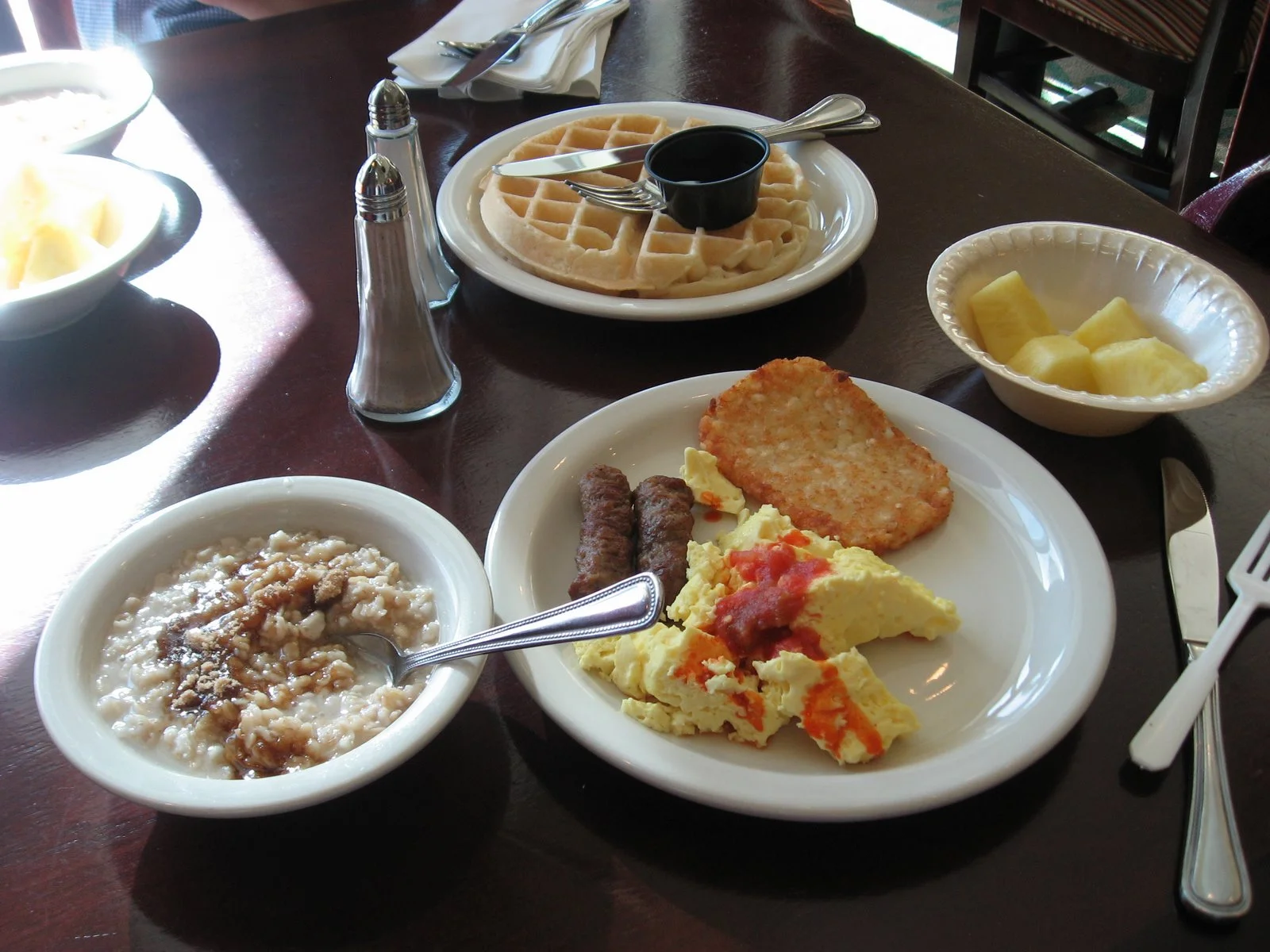 Like I said before, the Homewood Suites across from the Galleria is a great hotel - everything's new, the rooms are huge, staff is friendly. The free breakfast is the most bountiful I've ever come across. Eggs, potatoes, sausage, fresh fruit (not from a bag), real oatmeal (not instant), make-your-own waffels. This is probably what caused us not to eat a lot in Houston!