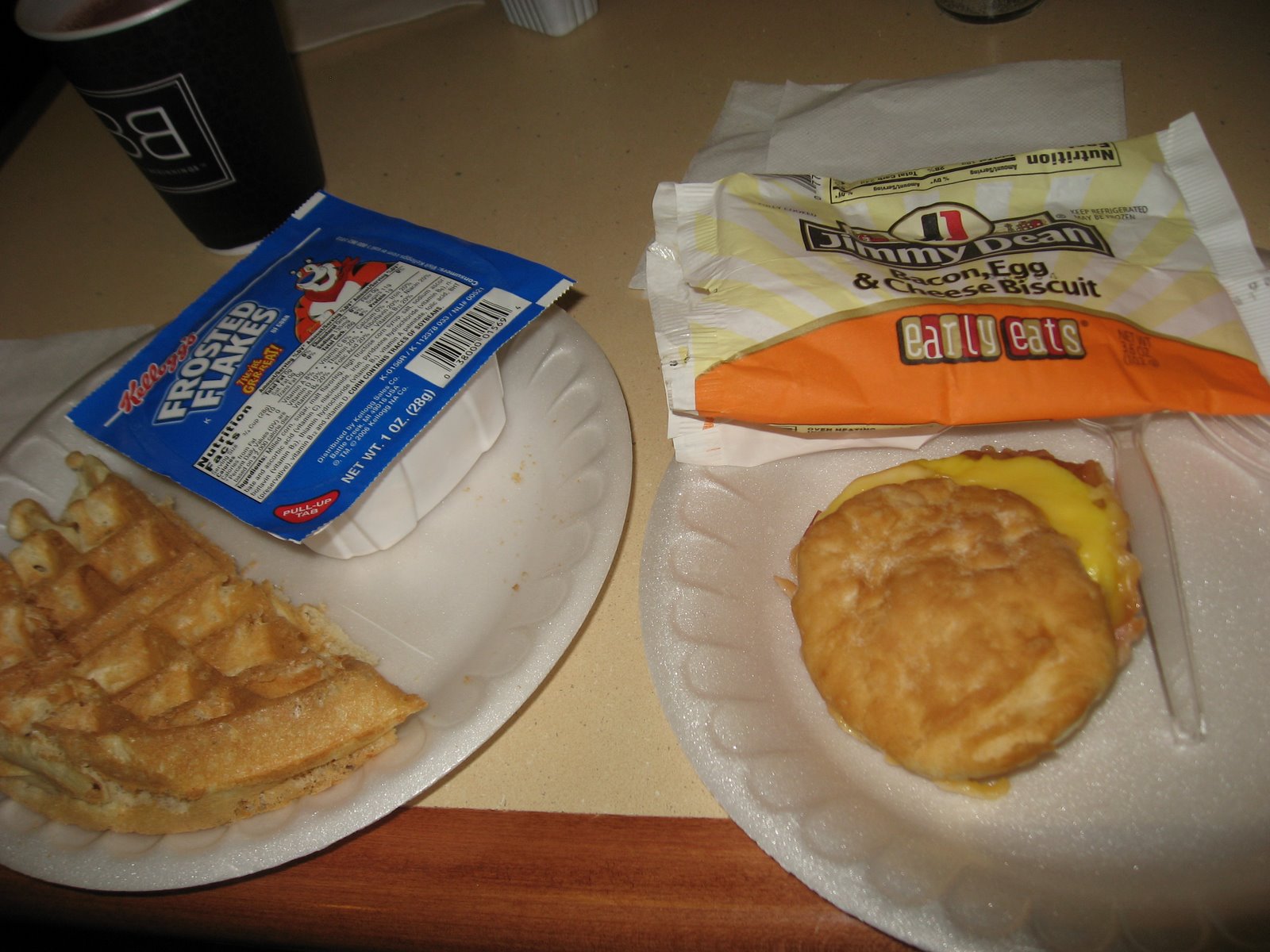 I was greatly anticipating the heavily promoted Jimmy Dean breakfast sandwiches that is actually co-branded with Early Eats. But walking to the breakfast bar and seeing the sandwiches in bags inside of the refrigerator, for you to microwave, signalled to me that this breakfast is a cut below the others. And it didn't help that the breakfast room at the Fairfield in Flagstaff was tiny and a complete zoo.