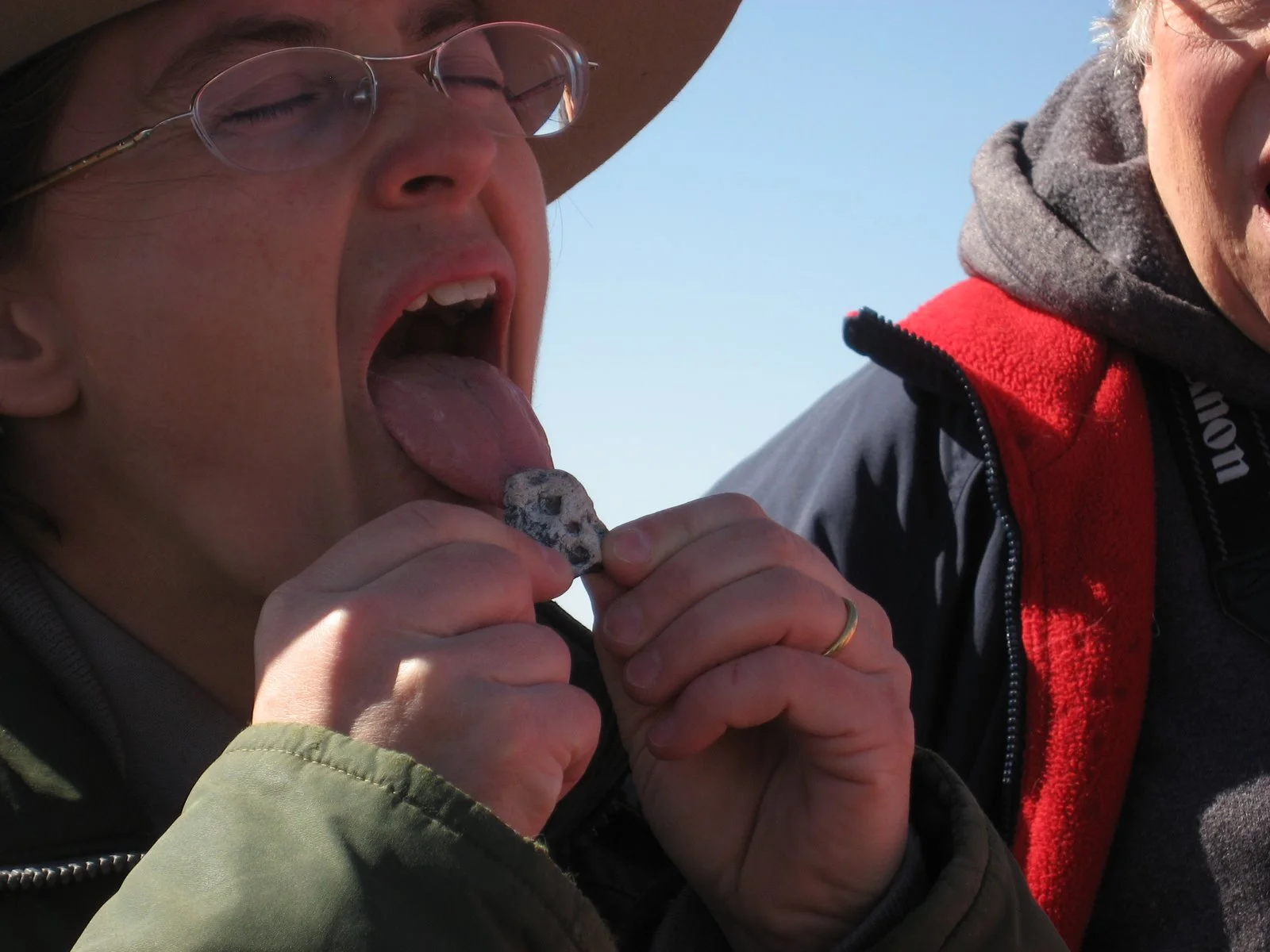 At Petrified Forest National Park, we had Ranger Rita who was also super excited about her park, and super eloquent telling us about archosaurs and hydrated silica. She took us off the Giant Logs trail to a part that was just carpeted with petrified wood. It was sad because the rest of the trail used to look like that, only visitors have stolen most of the small pieces. So our little group just walked on top of this carpet and looked for petrified wood, roots, and animal fossils. Here she is exhibiting how to tell if what you have is a fossil of a bone or not (it sticks to your tongue).