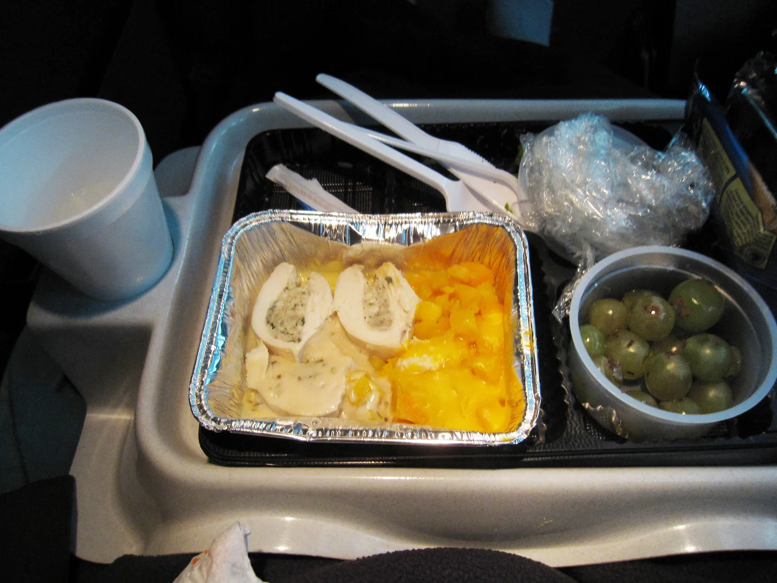 Then he came around with drinks (7 Up, Pepsi, water, or wine). Then we got metal containers of stuffed chicken and diced squash. Then more drinks.
