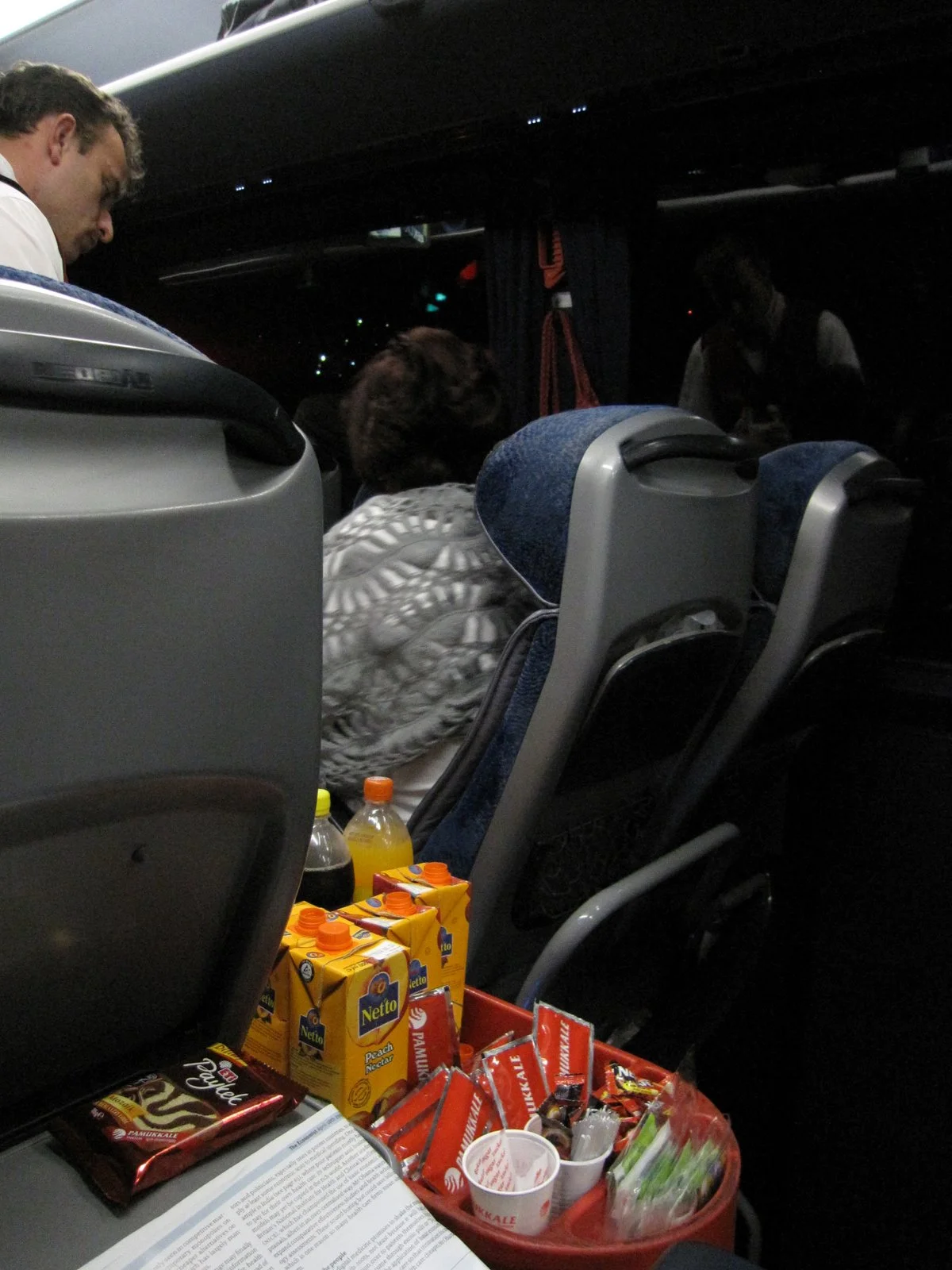 Unlike in Argentina where the attendant served everyone dinner and breakfast by hand, on this bus a tiny cart magically popped out of nowhere! We got our choice of snacks (packaged crackers, cookies, cake), and beverages.