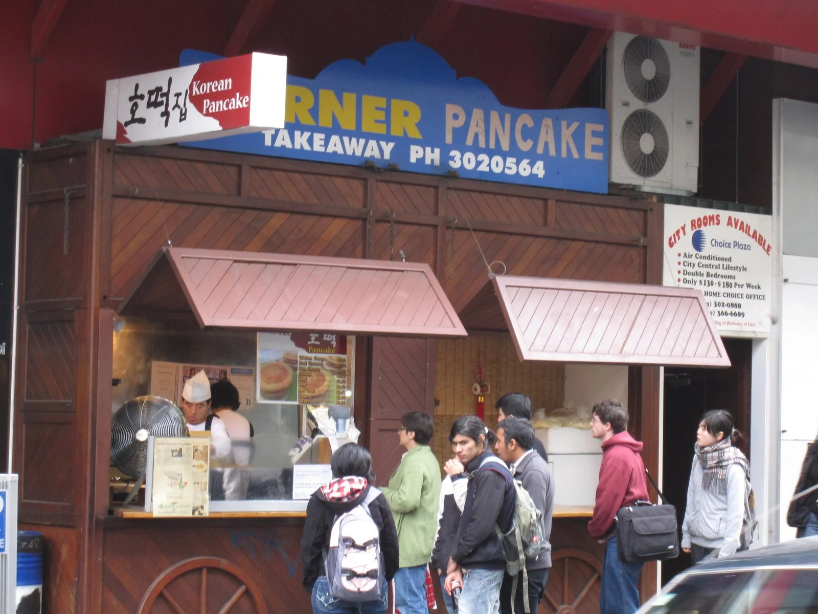 This food stall is called "Corner Pancake," and you can find it on Lorne St (where two of the other places listed below are). Every time I walked past, whether night or day, there was always a crowd gathered in front, waiting for their ho duk. At first I thought "Korean pancake" would be pa jun, but this is different. It's much breadier, and apparently it's traditionally served sweet. But the guy who runs this stall came up with some new flavors, including ham and cheese. I had a beef one; tasty but greasy. I can see why it's popular: at only NZ$2.50 or US$1.57, it's the cheapest food you can find in this city.