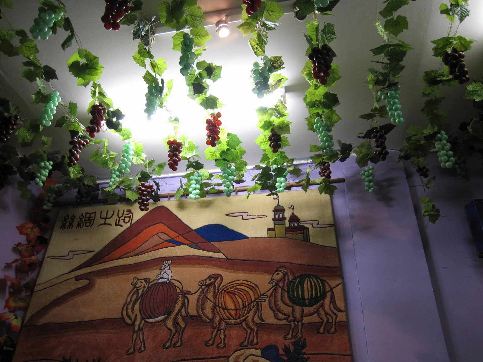 On my first night in Sydney, I was searching for a place to eat and found this restaurant called Da Xi Bei in Chinese (the Great Northwest). The name alludes to its specialty, food from Xinjiang. Interior decor included plastic grapes and vine leaves strung across the ceiling. Amazingly with the fluorescent lighting, it was highly evocative of my time in Xinjiang, since grape vines on terraces were some of my most memorable images.