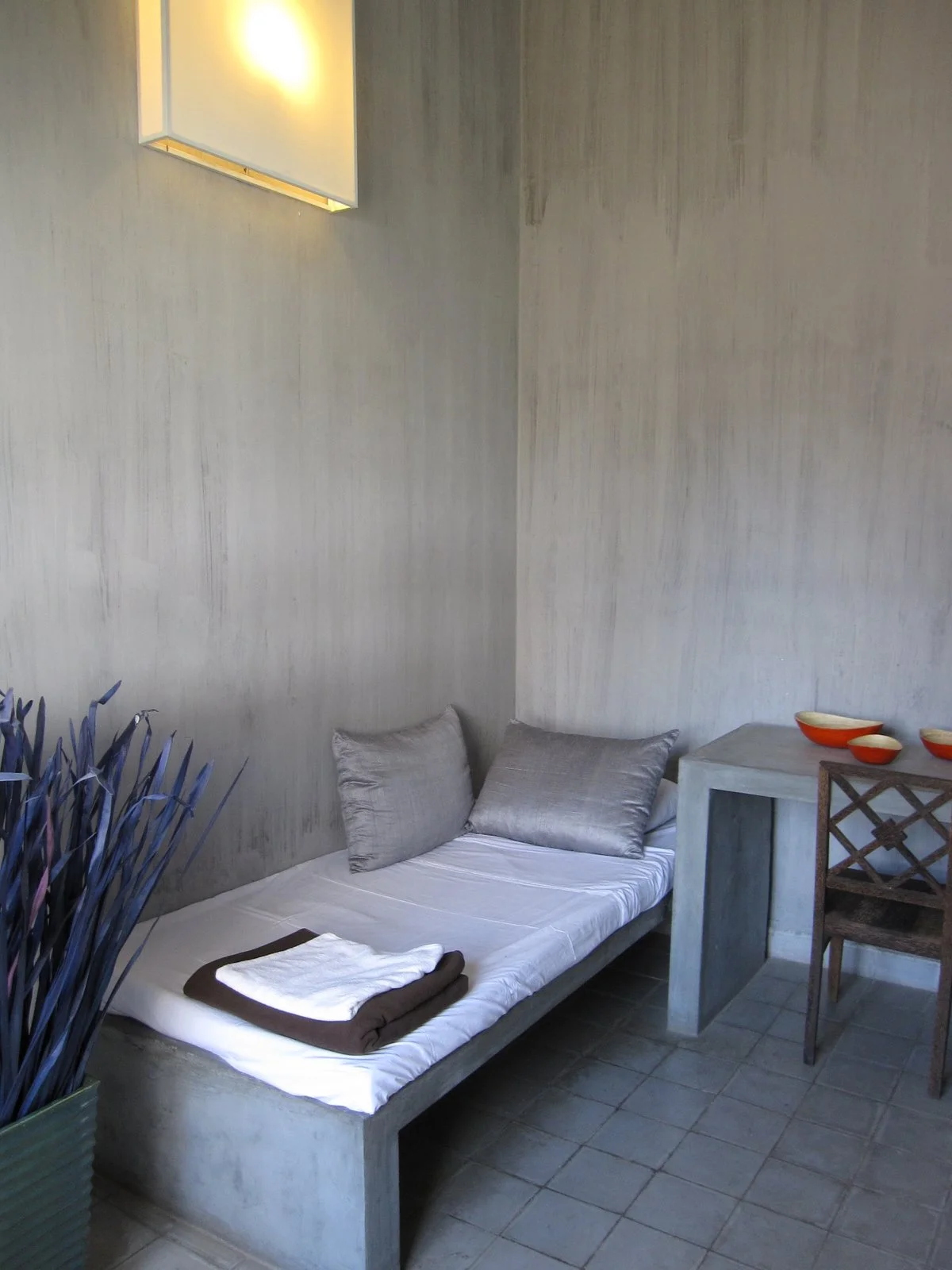 The Blue Lime website lists "concrete furniture" as the #1 room feature, so I was naturally most curious to see what the rooms were like! Indeed, everything except for the chairs was made of concrete. Actually a very nice and stylish effect. The only room with two separate beds available for our dates was a triple room, but it was so nice and worth the extra cost. There's a queen bed next to the door to the balcony (with more concrete seating, overlooking the pool). Then there's a concrete divider, where there's a twin bed with its own concrete desk.