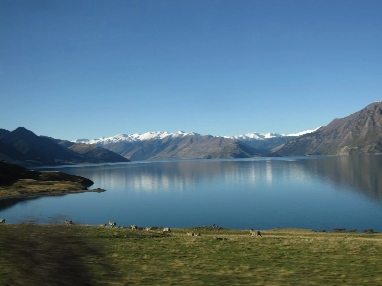 This might well have been marketed as a "scenic coach trip," since the scenery along the way was magnificent. Here we are passing Lake Hawea. The little dots in the foreground are sheep. People say there are 4 million people in NZ, and 40 million sheep! Plus lots of cows, and deer along the way. And they all look really healthy, roaming around and eating grass.