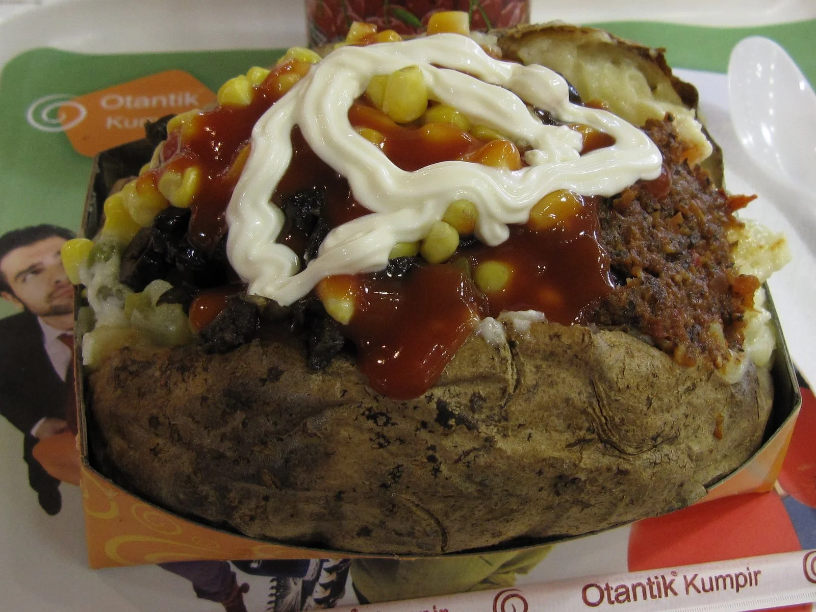 You can see people eating kumpir all over Turkey. First a baked potato is cut open, and filled with butter and cheese. This is all mixed up quickly by hand. On top of this mashed potato is a variety of toppings. I tried a classic version, with salami cubes, olives, pickles, corn, chili paste, and the best topping for a stuffed potato of all: potato salad. This all is then topped with ketchup and mayonnaise. I really liked the mix of textures and flavors, and of course the rib sticking goodness of mashed potato on the bottom. Half way through I was happy and satiated. After I finished it all, I was ready for a nap. I had my kumpir at Otantik Kumpir in the Cevahir mall.