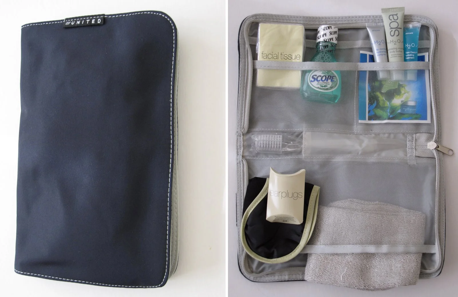 The regular United Airlines toiletry kit comes in a plain drawstring bag, and substitutes White by Smint Natural Whitening breath mints for the first class Scope, and only includes the H20+ Exfoliating Body Butter. Still, I like how it includes a pack of facial tissues, which do come in handy when traveling.