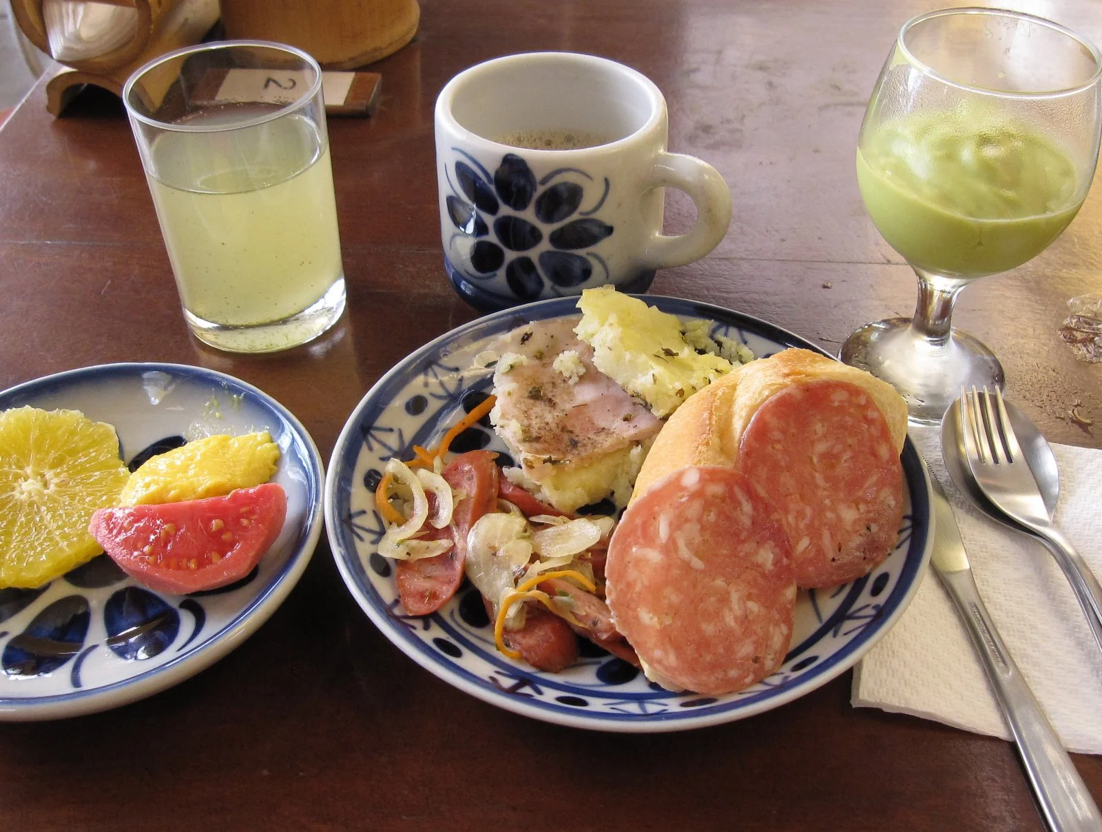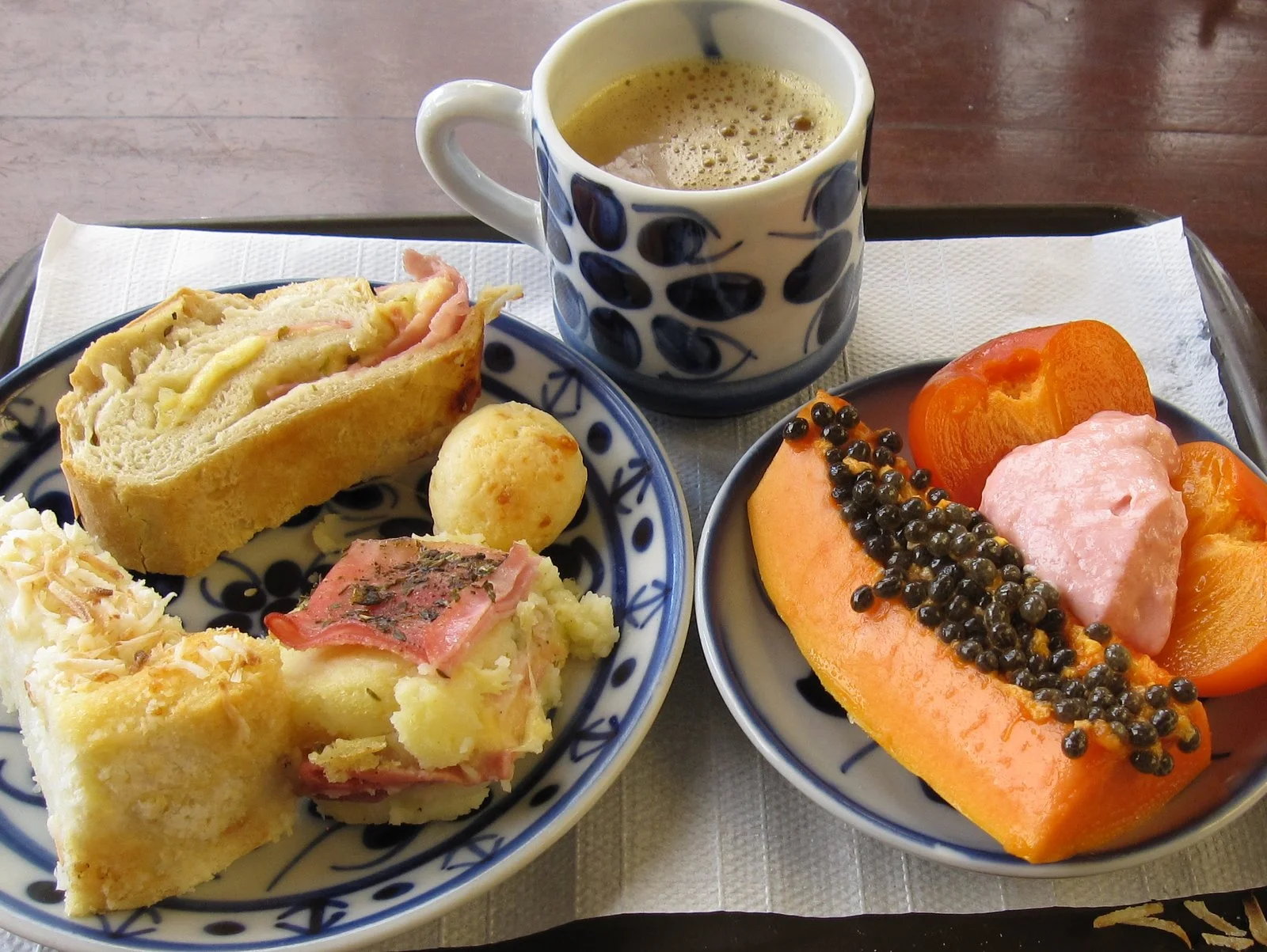 There were always standard items like a sausage and onion stir-fry, and potato and ham casserole. But then they always had a rotating selection of fresh fruit like star fruit, persimmon (brought over by the Japanese immigrants), and guava. And there were always around six different breakfast loaves and cakes, including chocolate cake and cornmeal bread steamed in banana leaves. In the breakfast below, I'm also trying out the guava jam (not from a can) and "limonada especial" which had mint blended in.