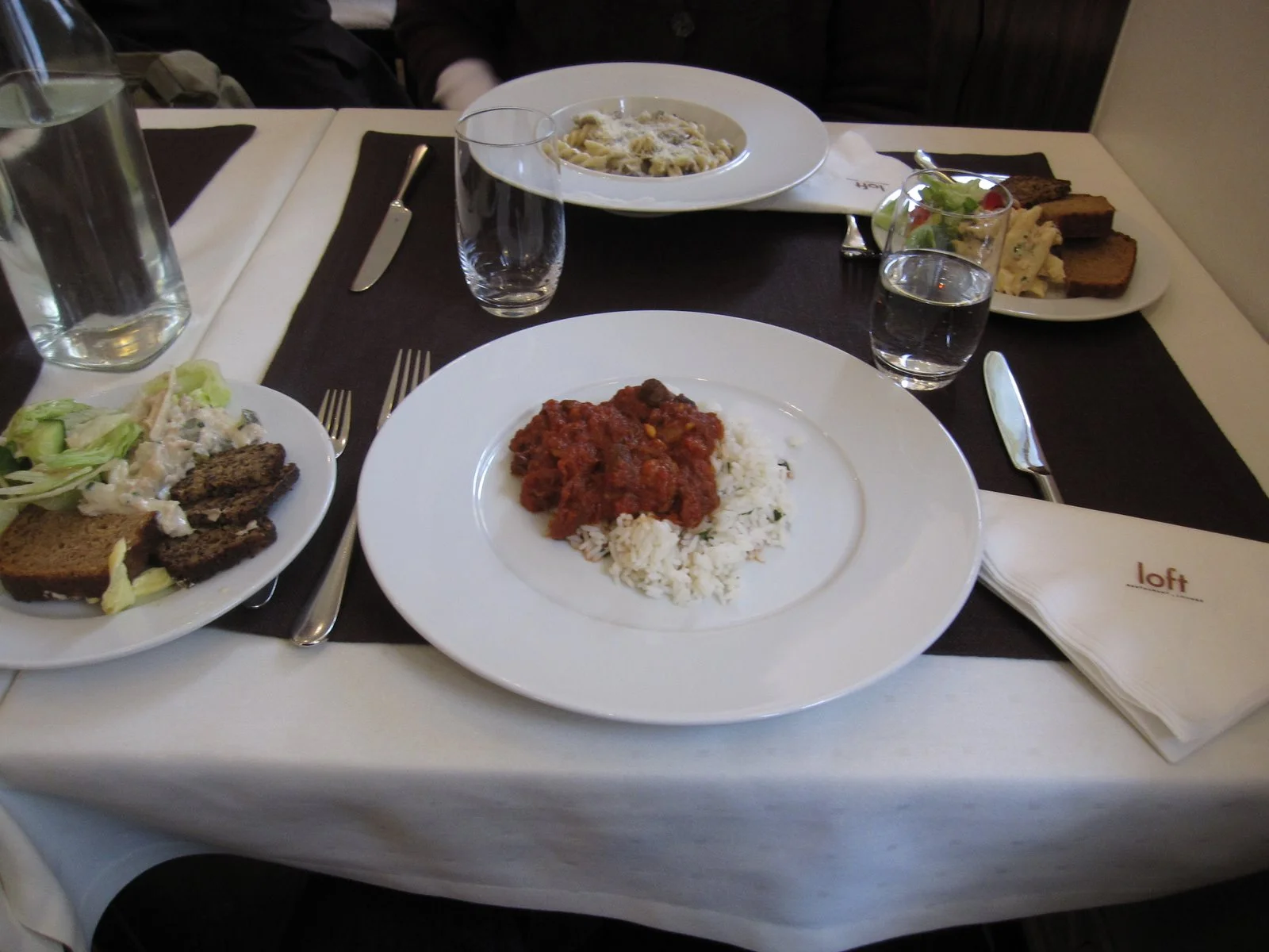 The two choices left by the time we arrived were "meat and rice" and "bacon mushroom pasta." I had the meat and rice, which turned out to be a tomato-based stewed beef over rice. We could help ourselves to a green salad, a tuna pasta salad, and two types of bread. And there was tea and coffee at the end of the meal (also self-service), and I was grateful that they leave a bottle of tap water on every table as standard.