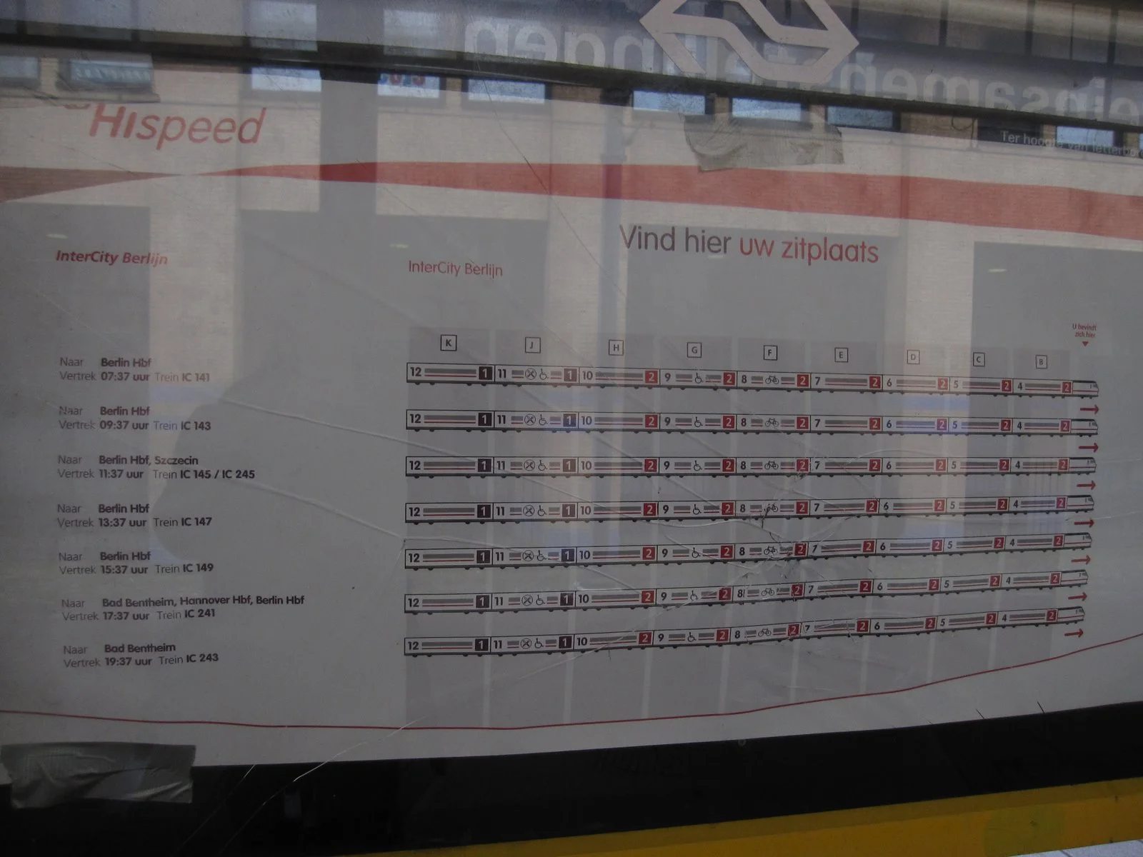 In Amersfoort, I learned that you look on a poster to find the train you are departing on. Then you can see where to stand (A, B, C, D...) according to which car you have a reservation for. You can see on this poster how similar Dutch is to English: "Vind hier uw zitplaats" = "Find here your sitplace."