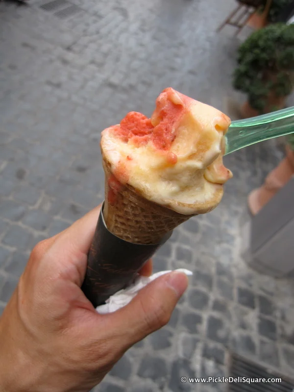 Now, San Crispino isn't 100% heavenly. I actually went to a different branch the next day (next to the Trevi Fountain). There, the guy was a lot friendlier, and he told me that the smallest size I could get with three flavors was the €4 size. For this round, I ordered (clockwise from top) meringue caramel, ginger cinnamon, and honey (though the latter two might be reversed). David Lebovitz who is usually right with everything, said that the meringue caramel would change my life. It didn't. With tiny pieces of egg white meringue stirred in, this was a bit too sweet for me. On the other hand, the ginger cinnamon and honey flavors were so subtle I couldn't tell which one was which. That's why I'm just guessing that honey is on the right and ginger cinnamon is on the left.