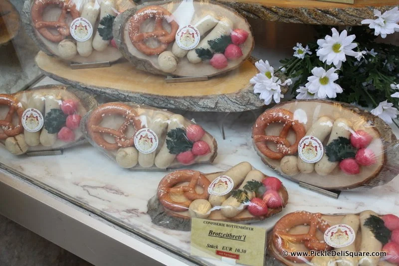 One of the Bavarian specialties is Weisswurst, or sausage made of veal. This stand at Viktualienmarkt, Kleiner Ochs'nbrater, says that they make it from calf's head too. It's traditionally served with a pretzel and sweet mustard. Now, after coming back to the US and reading more about it, I learned that you don't eat the skin, but rather squeeze out the meet or slice it down lengthwise and scoop it out!
