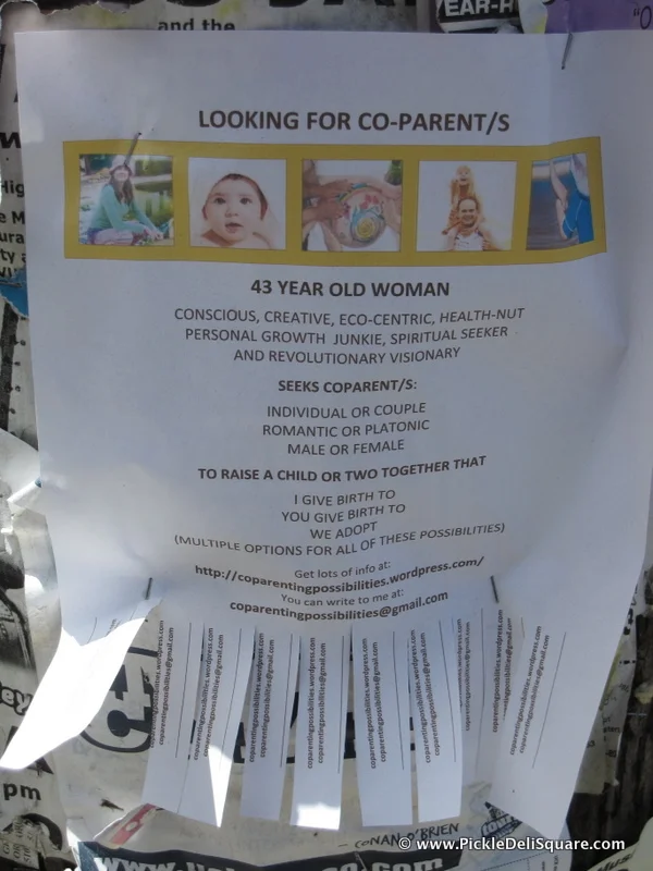 In case I forgot I was in Berkeley, I came across this flyer on a telephone post while waiting for the bus. I like how this individual is non gender-specific and is open to singular and plural options of both number of co-parents and number of children.