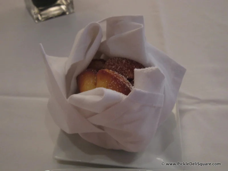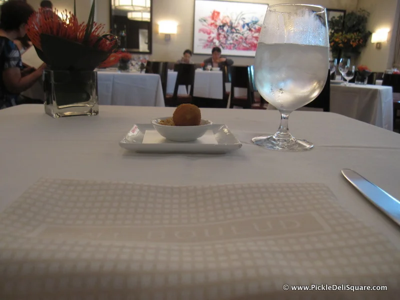 The dining room is elegant with muted colors, tablecloths, and paintings hanging on the walls. The amuse bouche was a fried fennel risotto ball. Light and creamy.