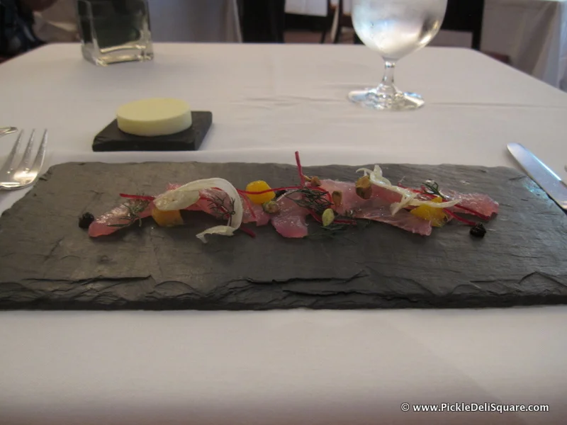 I had the beet cured fluke, which was firm and and a beautiful pink, translucent color like a jewel. I love presentations like this, where the ingredients are strewn about in a naturalistic but controlled way. And I also love the presentation on a cool slate slab.
