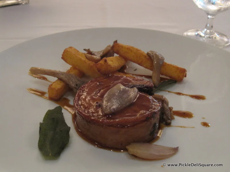 I had the veal, which says roasted on the menu, but I overheard the waiter say that it is cooked sous-vide. I didn't realize it could be both at once. Anyway, the veal was tender, but I left behind the fat layer and didn't eat the skin at all. There were a couple large pieces of garlic,. I think I liked the polenta fries the best - subtle flavor and a nice crunch from the corn.