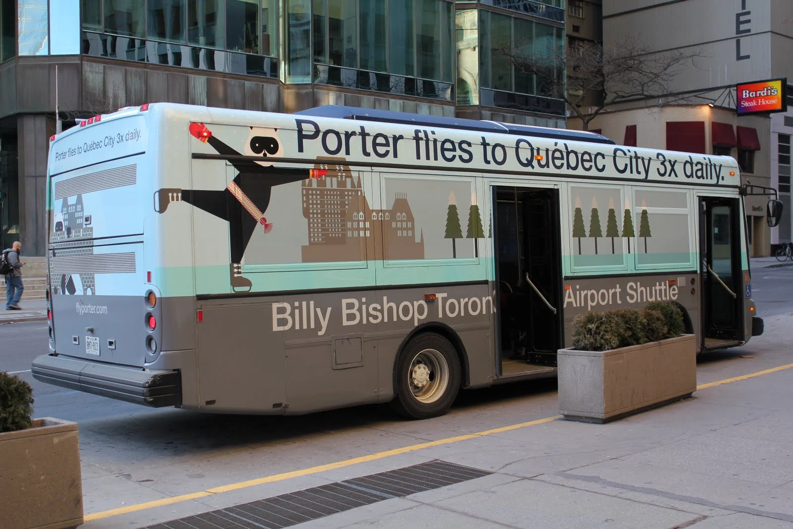 Porter flies from Billy Bishop Toronto City Airport (YTZ), which is spitting distance from downtown Toronto. The airline offers a free shuttle from the Fairmont Royal York Hotel at Union Station. The buses are painted with graphics advertising their service to Quebec City (YQB), my destination! You'll see a lot of their raccoon mascot, Mr. Porter.