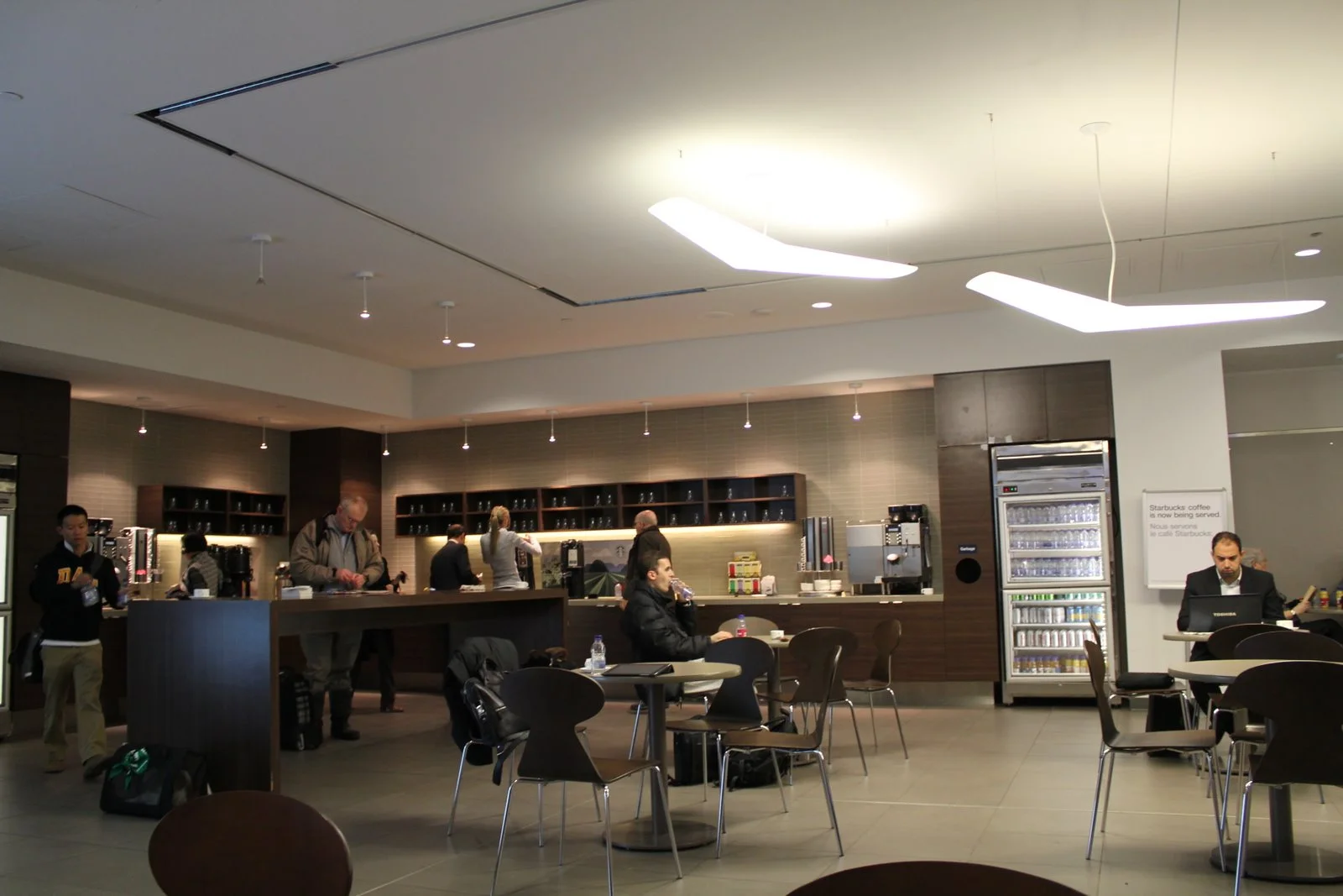 After a very quick check in, you go through security and into the waiting area. It's like a big lounge, with plenty of seats, power outlets, a variety of Canadian newspapers, customer service agents...