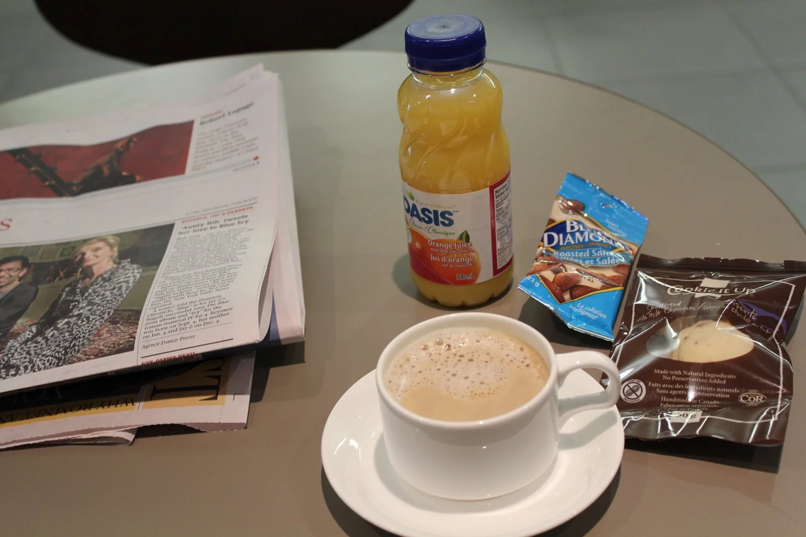 ...and a snack area with shortbread cookies, smoked almonds, bottled water, juices and soft drinks, Starbucks drip coffee, and automatic espresso machines. The "everyone's a VIP" attitude reminded me of my experience flying Bangkok Airways in Thailand (trip report here).