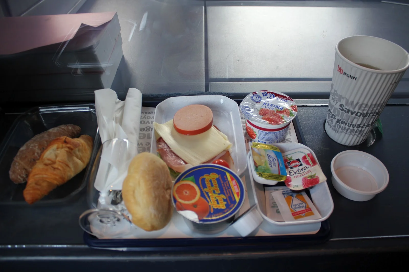 Breakfast is served at the seat. It was pretty basic although bountiful, with three rolls (cold), cheese, liverwurst, and cold cuts, orange juice, and yogurt. I had green tea to accompany, and the attendant gave me a little plastic lid to put the used tea bag in.