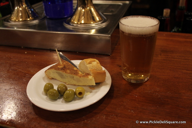 I ordered a beer, Alhambra brand, and I had forgotten that my coworker told me about the free tapas in Granada. In Granada, it's customary that when you order a drink, you get free tapas! So after I got my beer, out came a plate of tortilla de patatas, bread, and olives.
