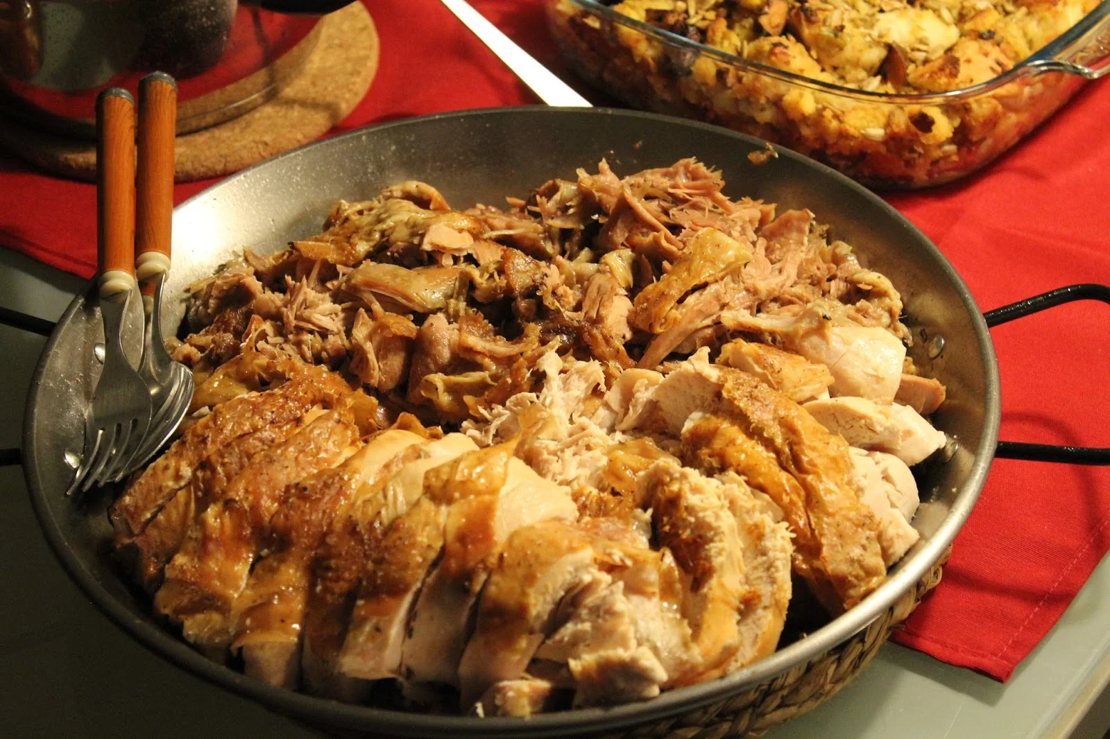 The paella pan turned out to be perfect for first frying up the turkey leg confit, then plating the breast meat alongside and keeping it all nice and warm.