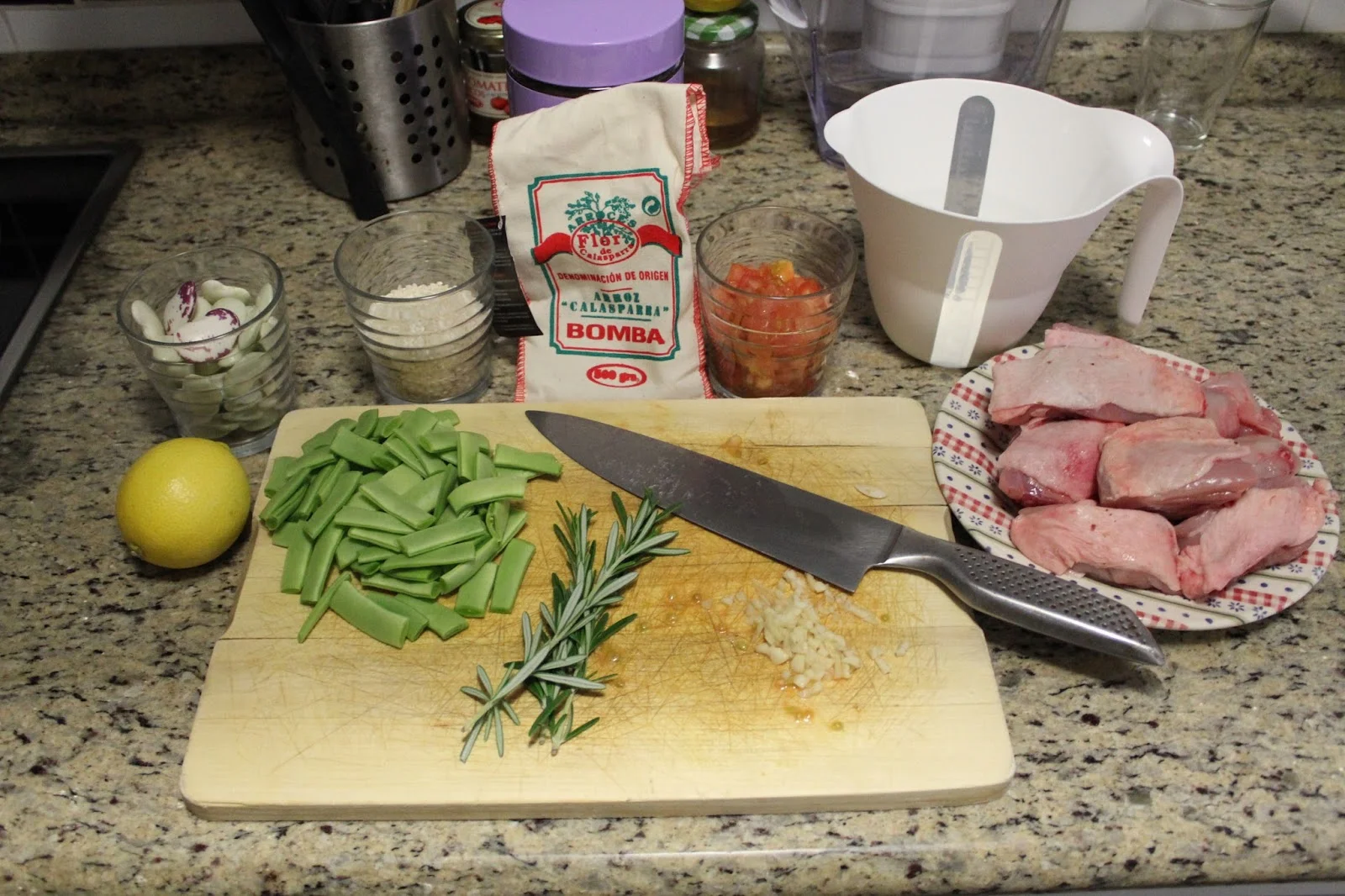 First the ingredients. For my favorite paella valenciana, I have the garrofón, which are the broad lima-like beans, bomba rice, flat green beans, some grated tomato, and chicken legs and rabbit cut up. I just went to the poultry butcher (they always have rabbit too), and asked for meat for paella for two. And they went and found the parts and cut them up for me. Plus rosemary for the end of the cooking process.