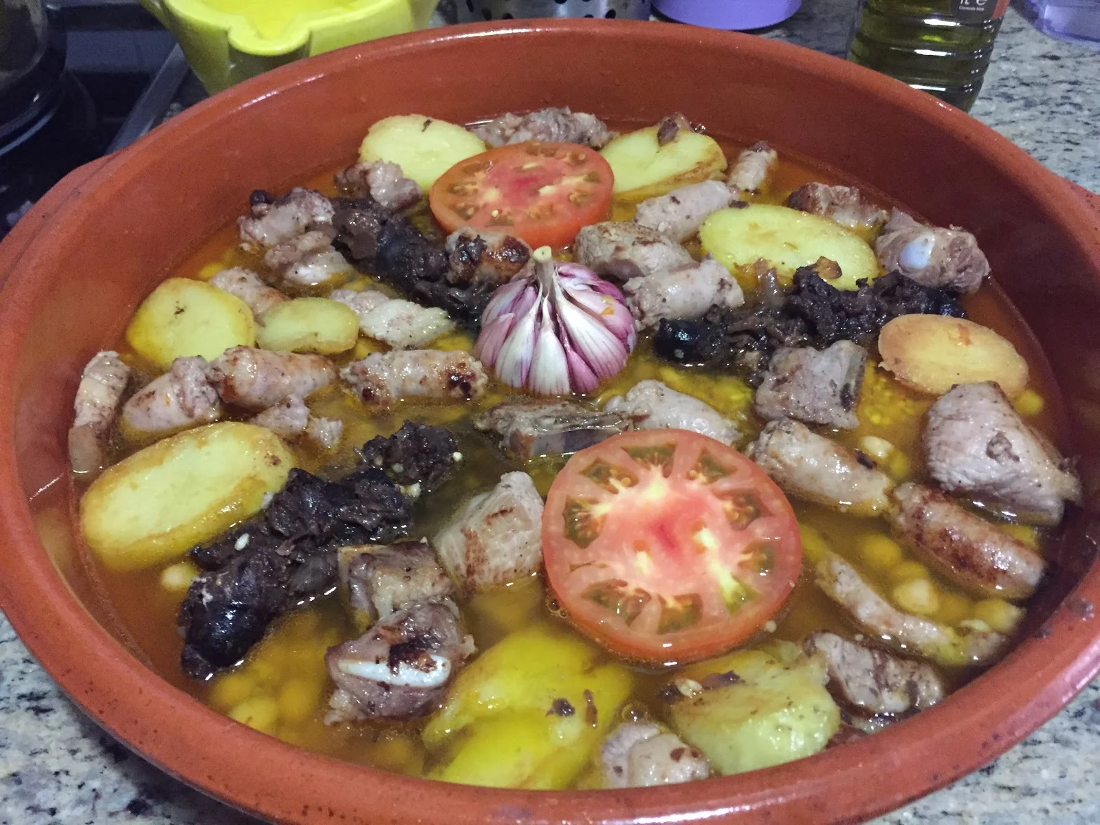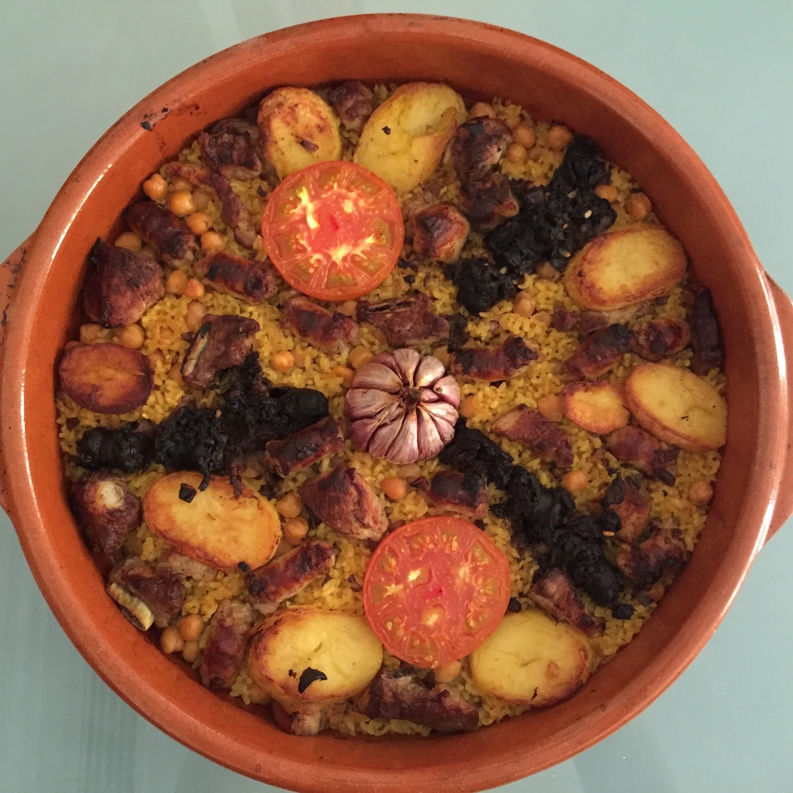 Next, put the rice and chickpea mixture in a cazuela. Then on top, arrange all of the ingredients, putting the garlic in the middle. Valencianos seem to like radial patterns so that's what I went for.
