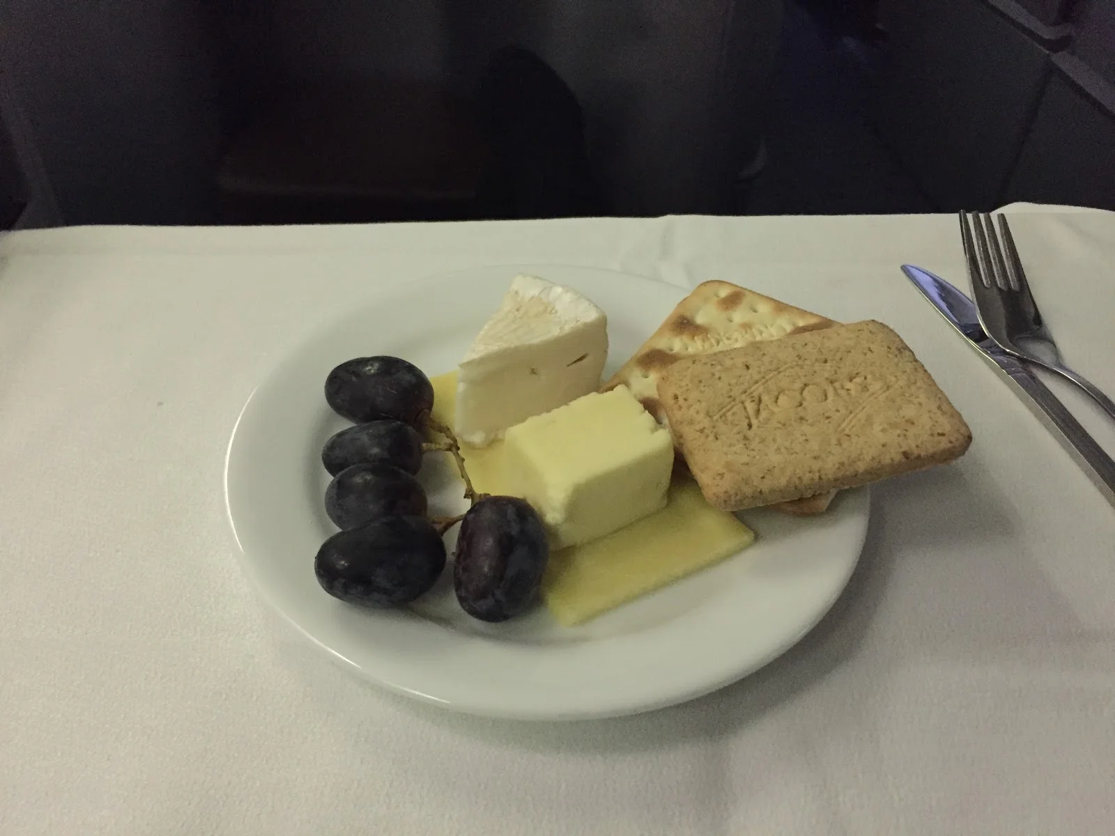 Cheese and crackers. The flight attendant had each passenger pick out the crackers they wanted from the metal bowl using tongs. It was so slippery, I spilled the crackers all over the table. Oops!