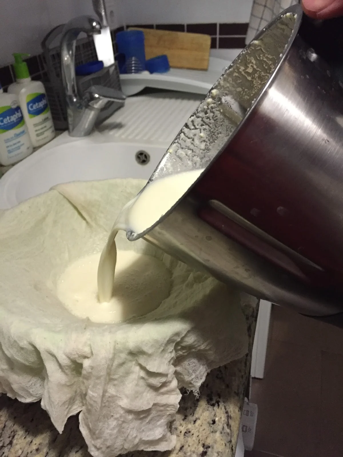 6. Pour the mixture through cheesecloth, and let it sit. This allows more liquid to flow through, and also allows the mixture to cool so you can handle it in the next step.