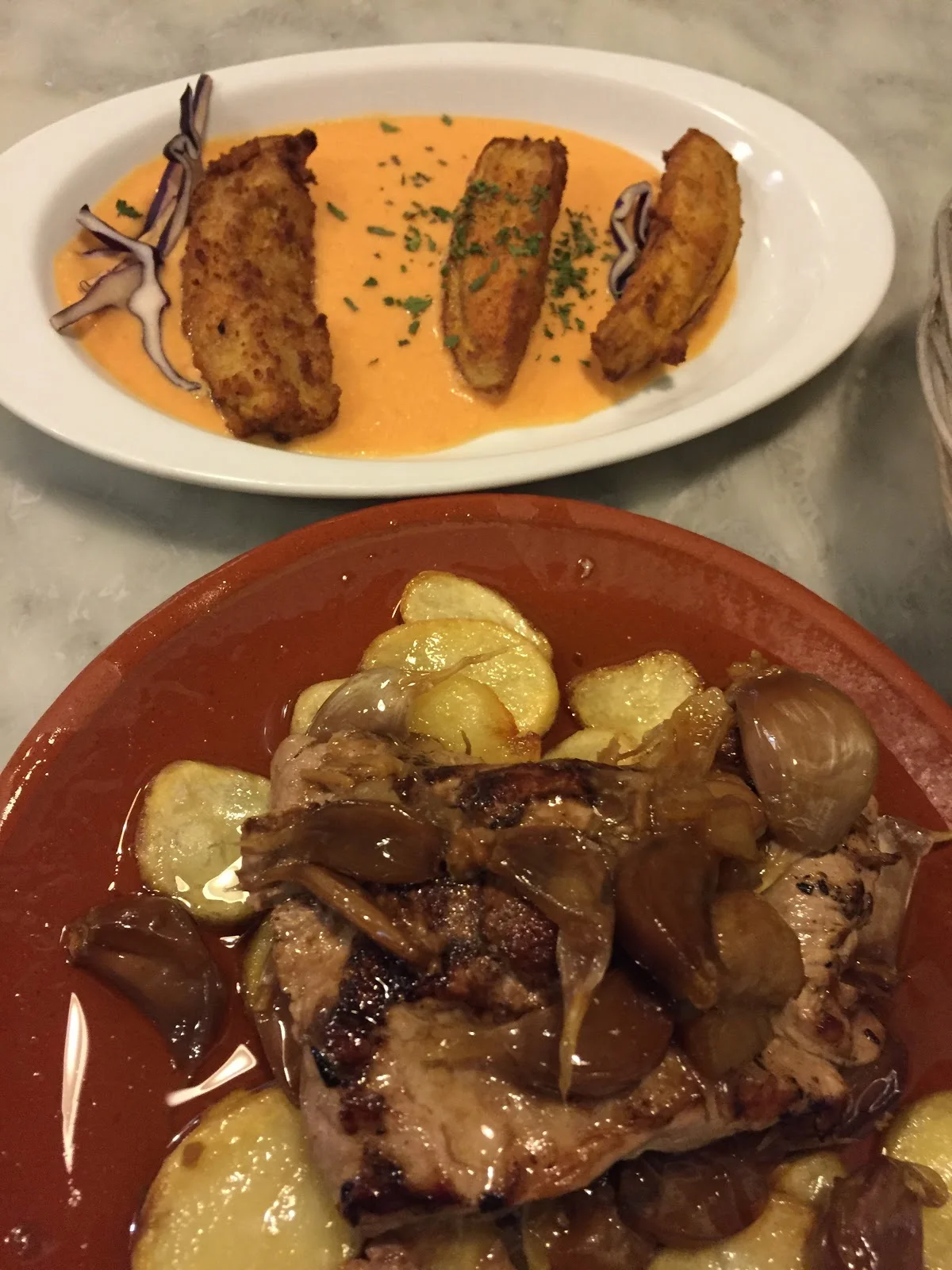 I ordered a tapa-sized pork with whisky sauce, expecting just a few bites of this typical Sevilla specialty. Instead I got this huge plate! The mound of garlic on top was very tasty, but I have to say it was swimming in oil, which was not to my taste.