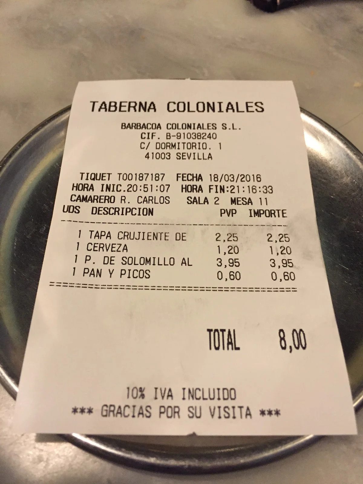 I double-checked the bill to be sure the pork with whisky sauce indeed was tapa-sized, since you can order each plate in different portion sizes, tapas being the smallest. Yes, I got what I thought I ordered! Just 3.95 € for my pork dish, and 2.25 € for the eggplant. In Sevilla, they also bring you some bread and/or breadsticks, and you're charged for this too, kind of like a cover charge.