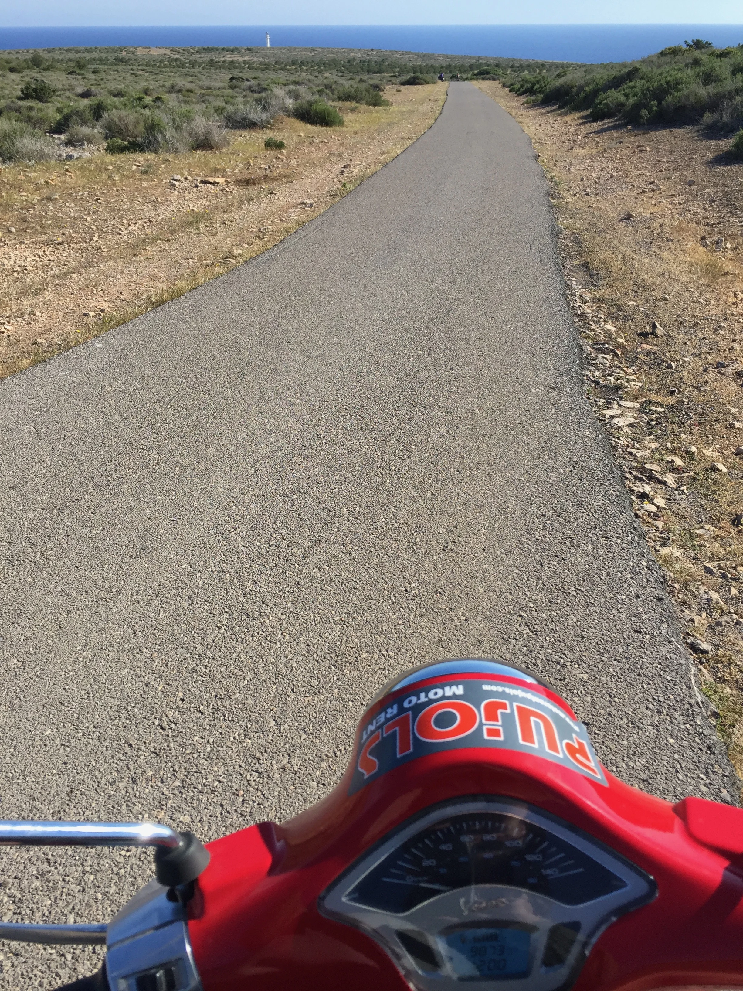 After lunch, the plan had originally been to continue east to the easternmost tip of the island, where the Faro de la Mola lighthouse was. But by this time I was rather grumpy about riding the scooter more. I will admit, I hated riding the scooter. This being my first time riding one, I just felt so exposed! And felt so ready to tip over if I went into a curve too fast! And with the small engine of my scooter, I needed to continually gun the engine to maintain speed, rather than cruising along more confidently with the more powerful Vespa.