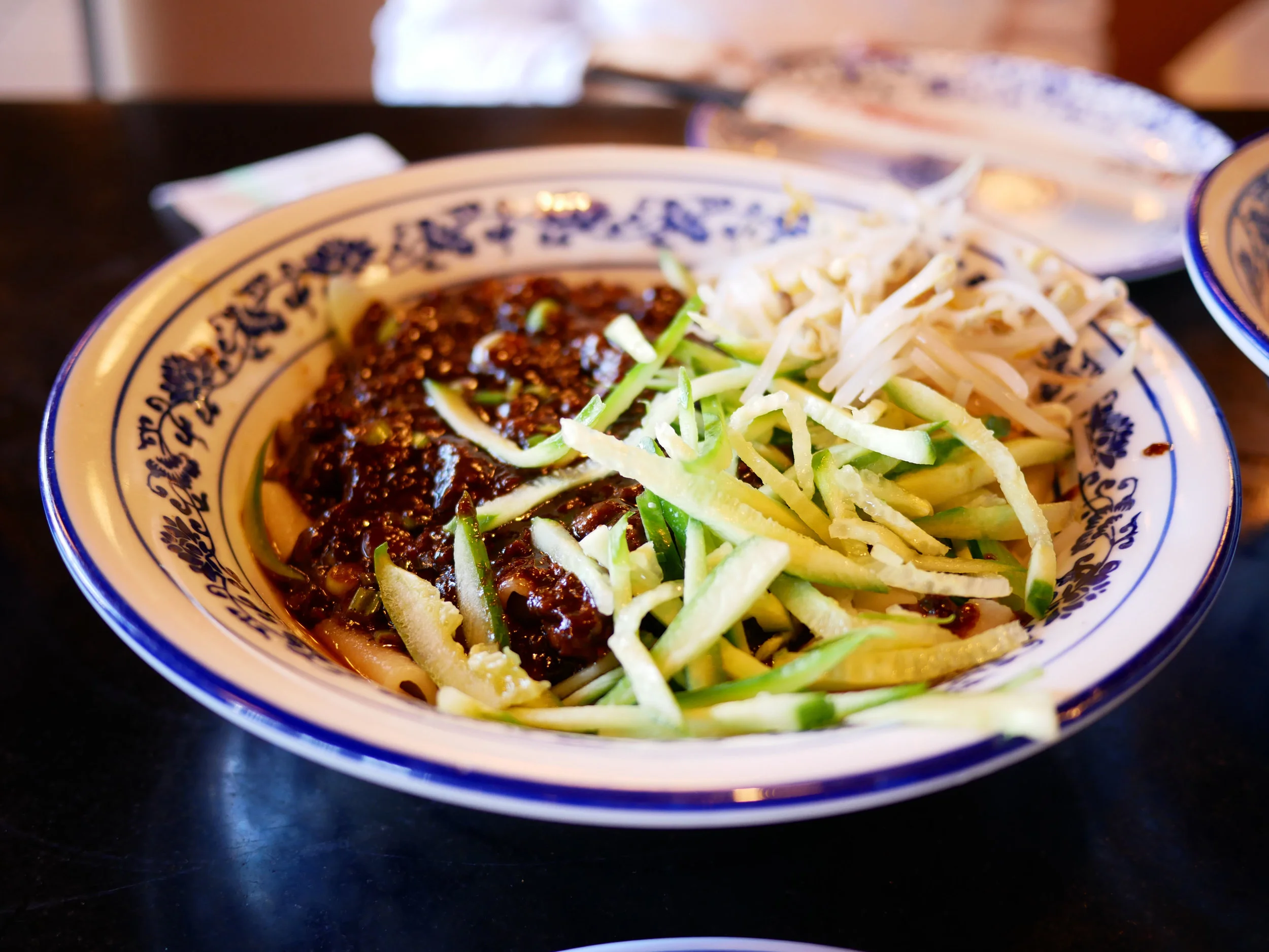 We also ordered the zha jiang mian. This came with the sweetish zhajiang sauce with ground meat, and piles of bean sprouts and cucumbers. The noodles were similar, but a bit narrower. I liked this a bit less, but I think it's only because I enjoy zha jiang mian less because of the sweet taste.