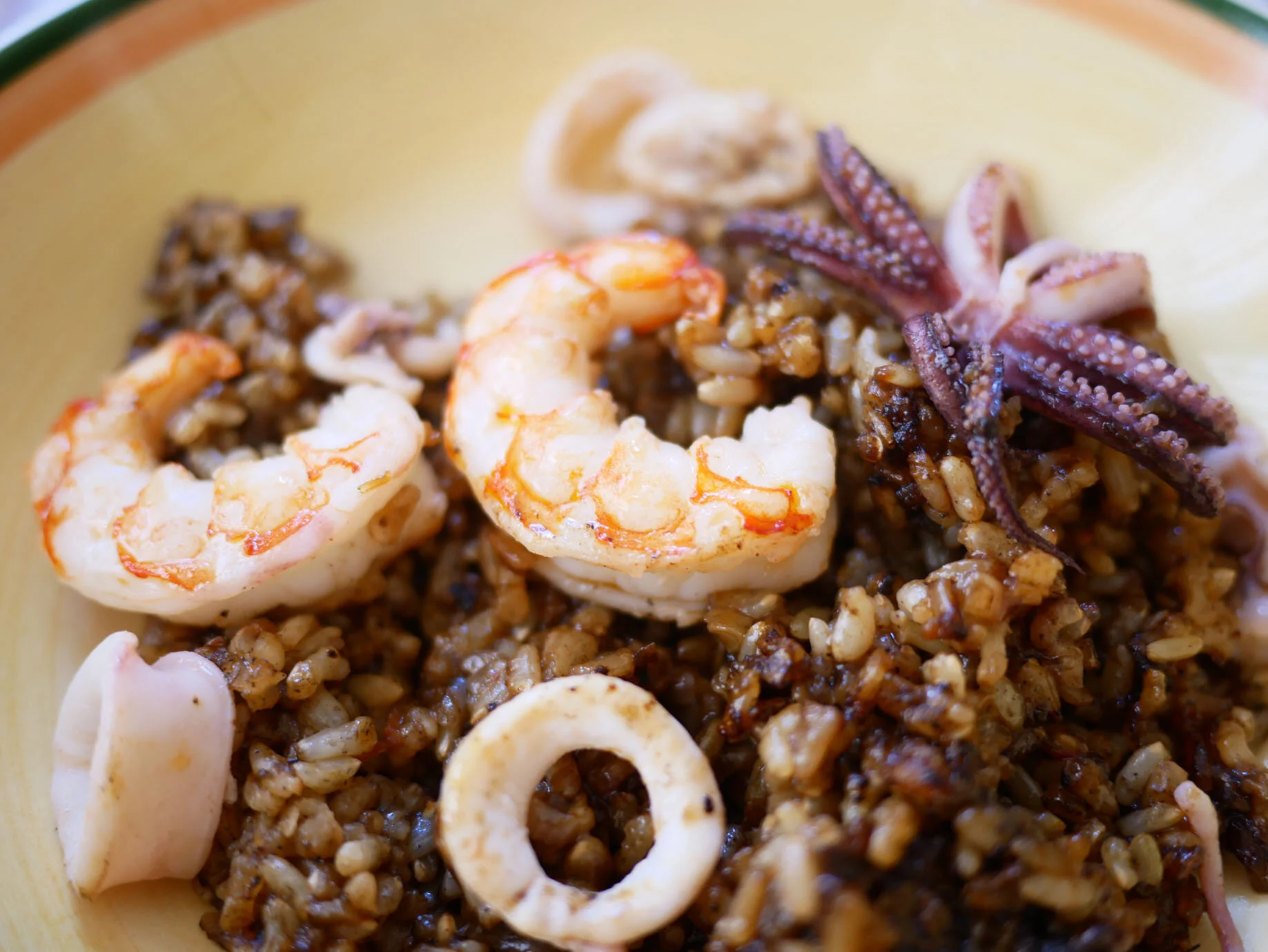 Well, I’d have to say this rice turned out decently black! However, a challenge with using brown rice for paella is that it takes much longer to cook than white bomba rice, so unfortunately even after cooking a very long time, the rice was still quite hard.
