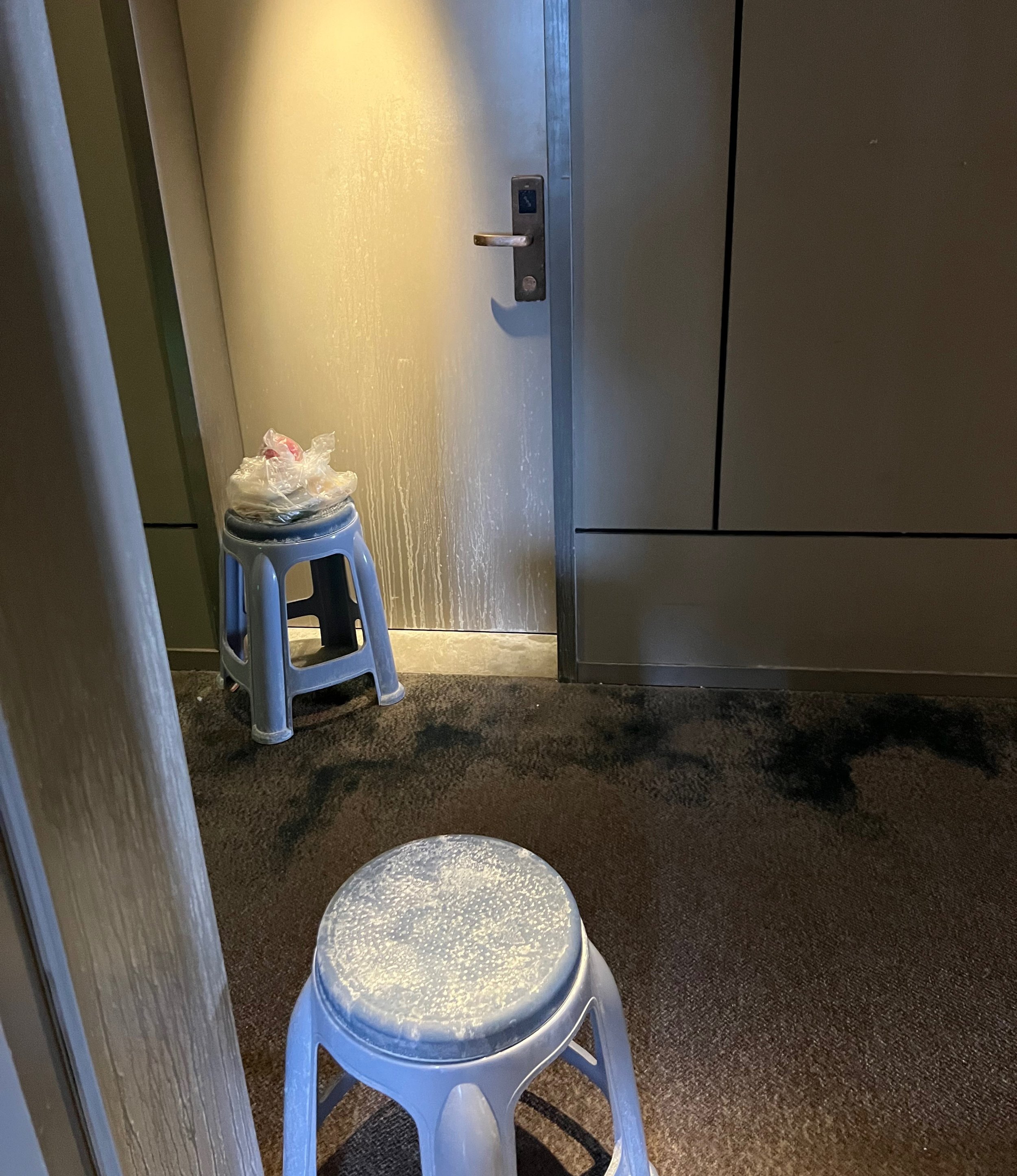 By the way, this is how meals show up. The meals are placed on a plastic stool outside the door by the deliver person. One delivery person is good at yelling to everyone that the meal has arrived, but sometimes they delivery them and no one says anything, so you kind of have to listen for them. You can see how the doors, stools, and everything are streaked and caked with dried up disinfectant. And sometimes this dried up disinfectant gets attached to the underside of the bag of food due to condensation, and gets redeposited on the desk when I put it down. And then I have to wipe down the desk again.