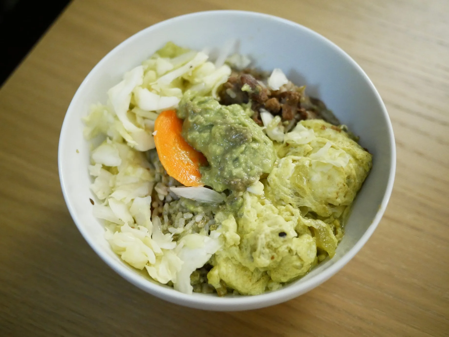 For dinner, I cooked some rice, heated up the refried beans from this weekend, scrambled eggs with the jarred New Mexico green pepper, and topped with some of the curtido and avocado salsa.