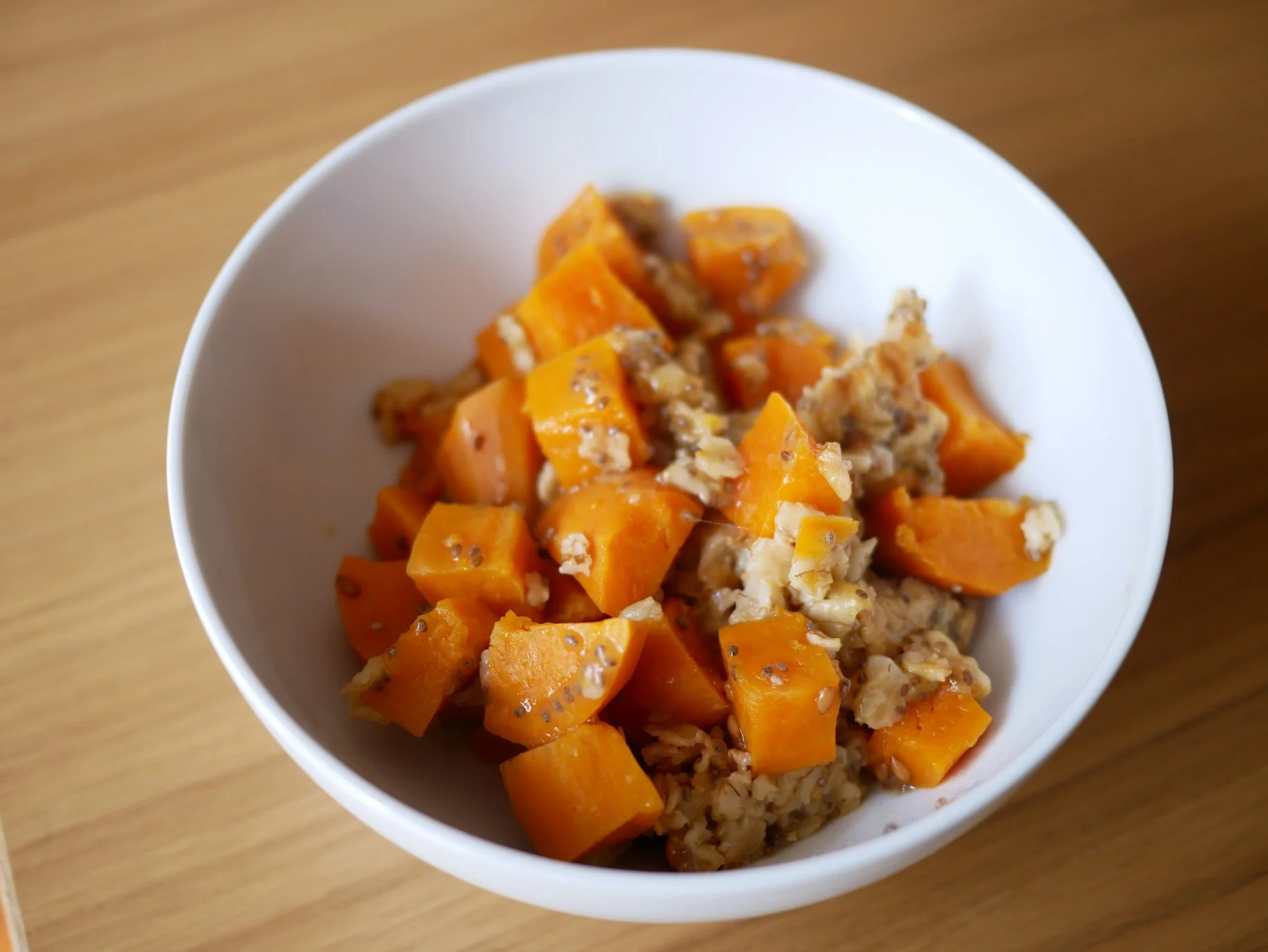 This morning I had a bowl of sweet potato and rolled oats (and chia and flaxseed). I liked yesterday’s bowl, but the longer cooking time for steel cut oats made the sweet potato rather soft. To keep them firmer, I used rolled oats this time, for a shorter cooking time. I like this method better, although it was a bit dry.