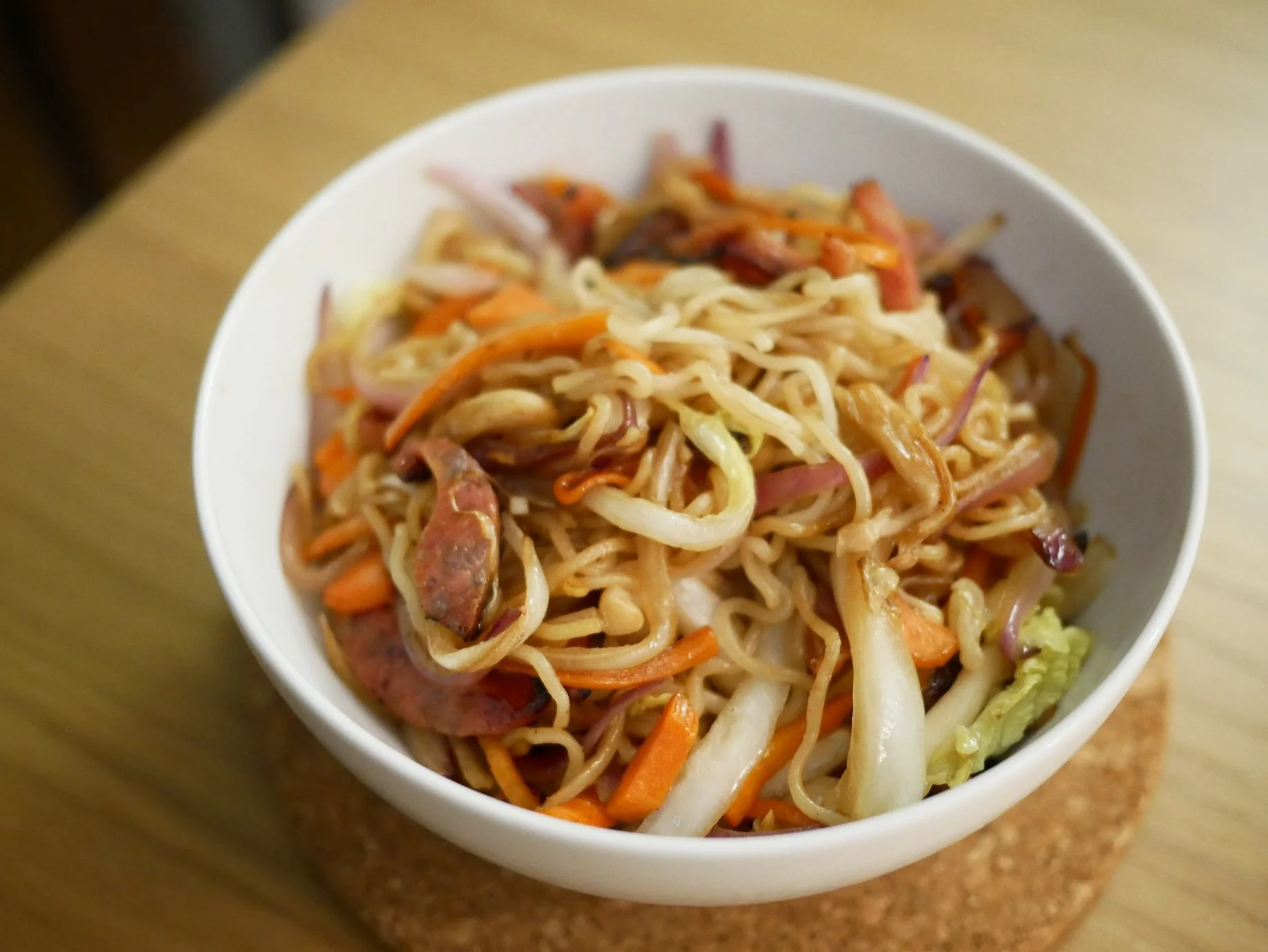 Then I fried up the different ingredients, starting with the sausage, then the Napa cabbage separately, then the carrots and onions, then the mushrooms separately, then added all of the cooked ingredients back in, with the garlic, then the noodles, and finally the sauce - first to coat the noodles, then I used my tongs to combine everything. So many steps! But I am very happy with how these stir-fried noodles came out. The noodles were a good texture - not overcooked -, and all of the different ingredients had their own flavor. I didn’t add any salt to the vegetables at all!