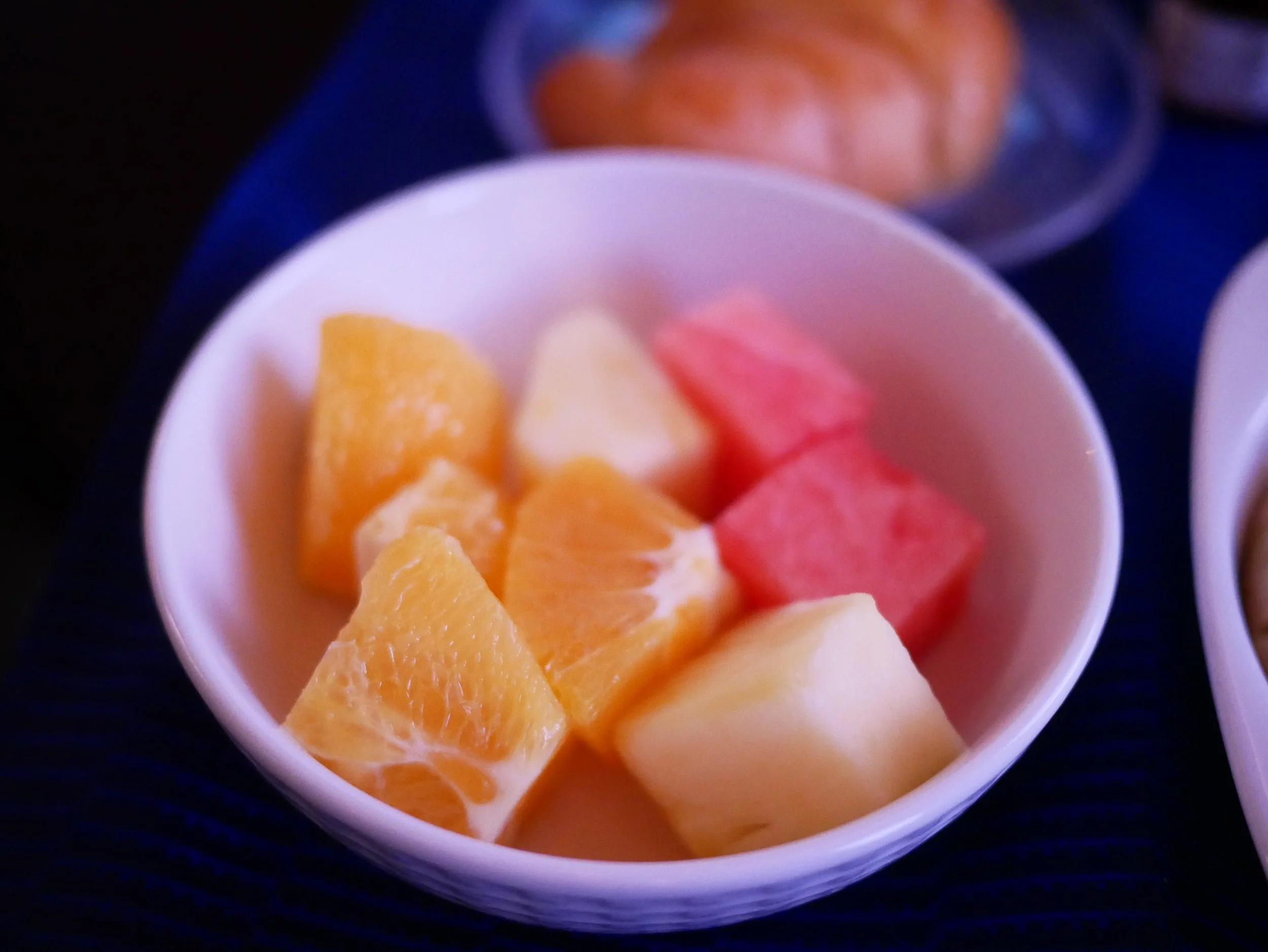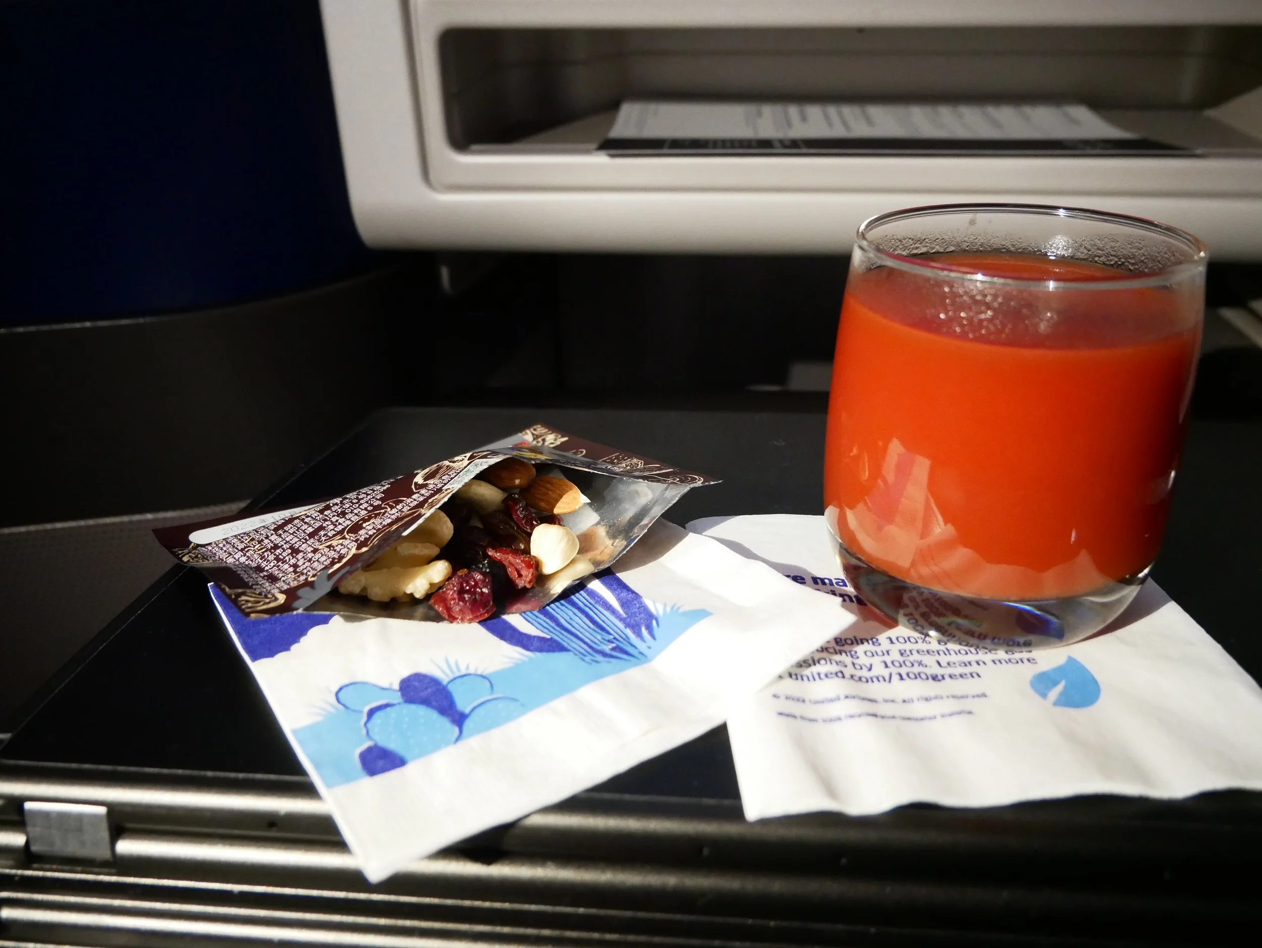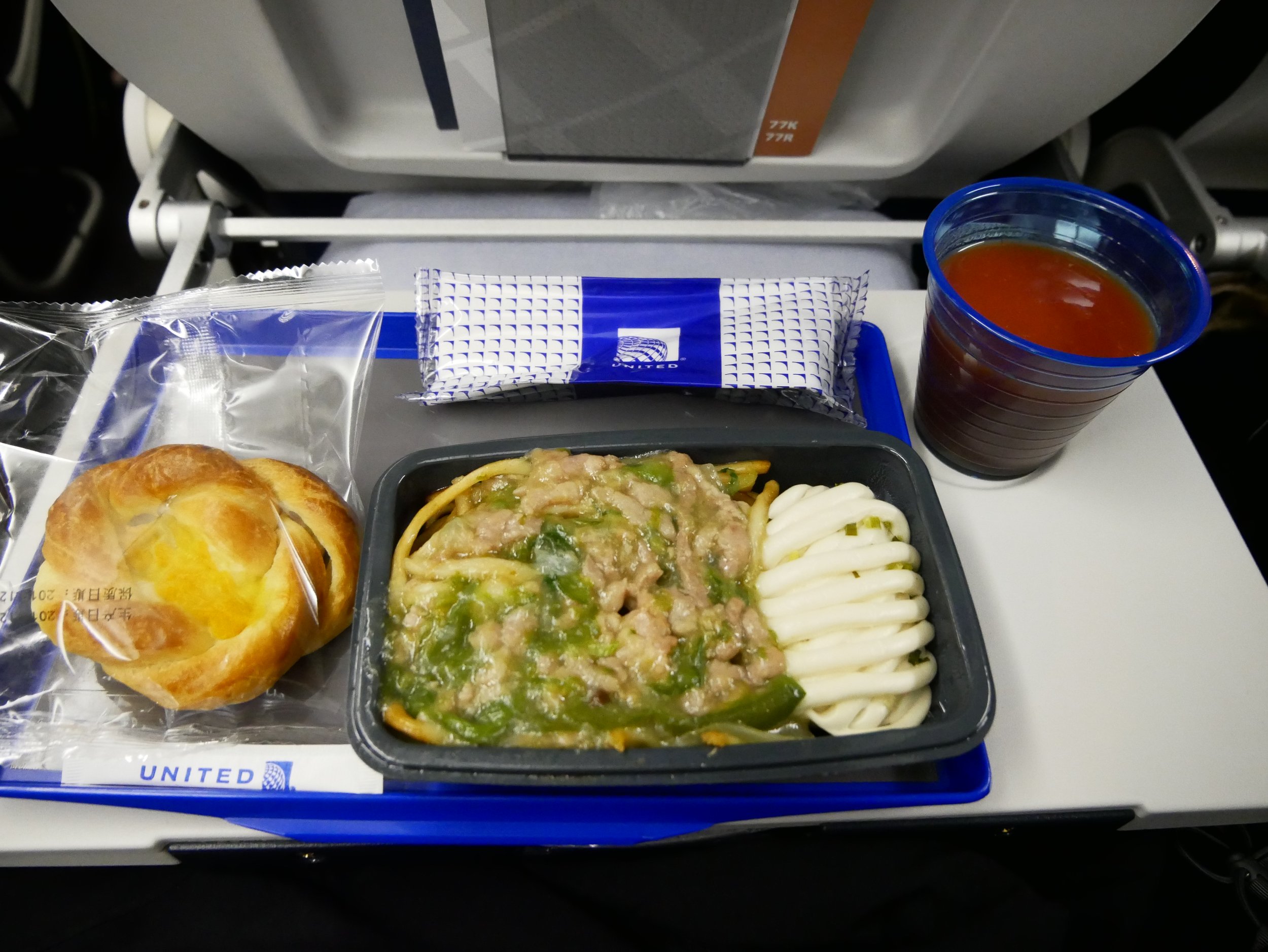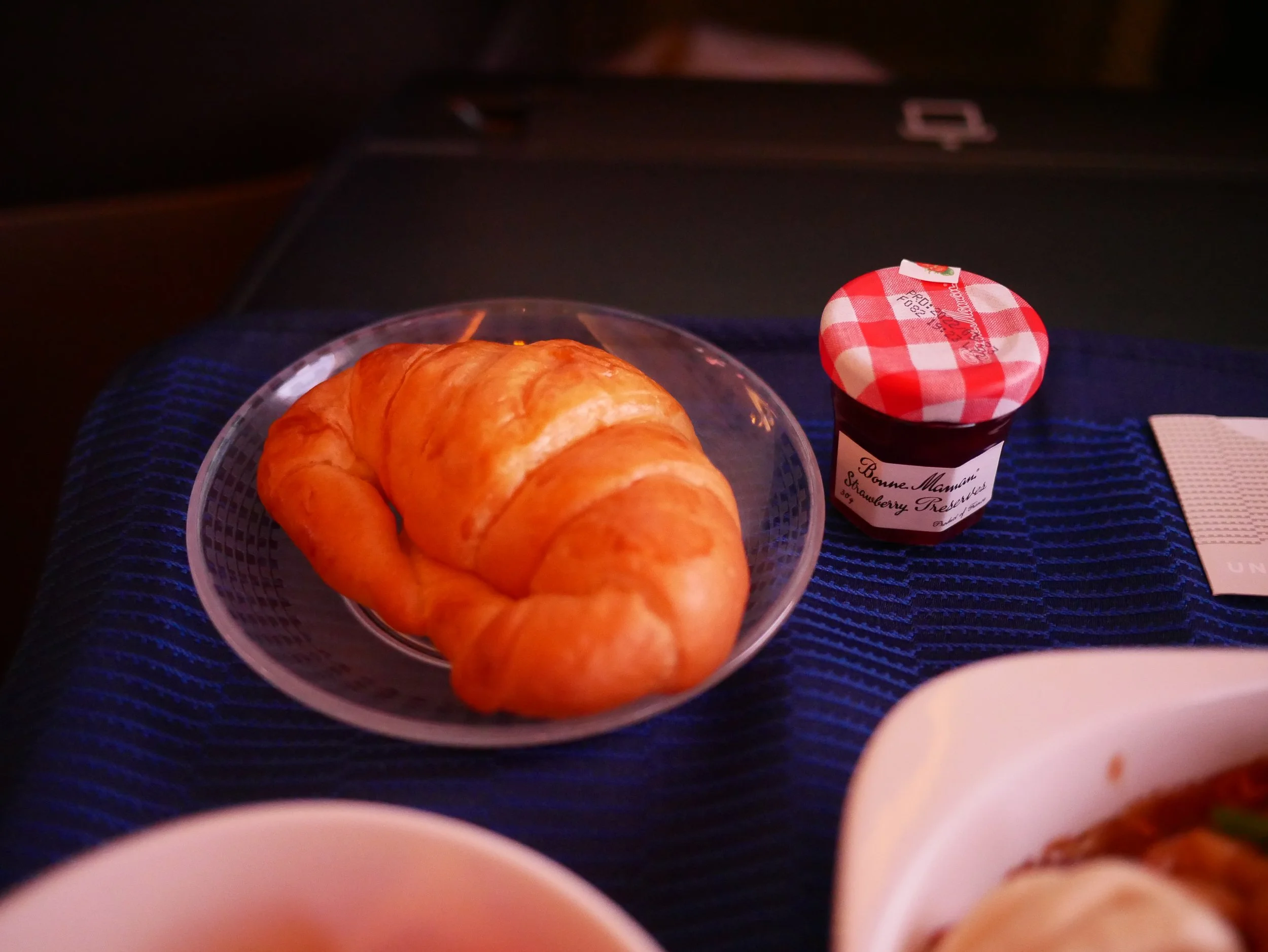 I also hadn’t seen United serve the mini glass bottle of Bonne Maman preserves. This was a classy touch! Plus the croissant was warmed, and plated. Last year, we had a muffin that was heated within a plastic wrap that shrank around the muffin.