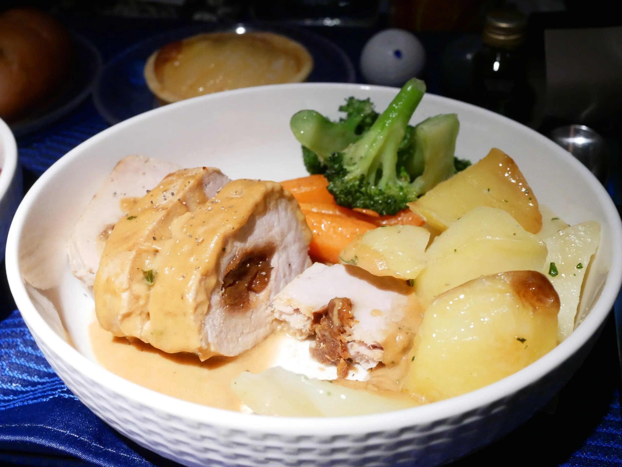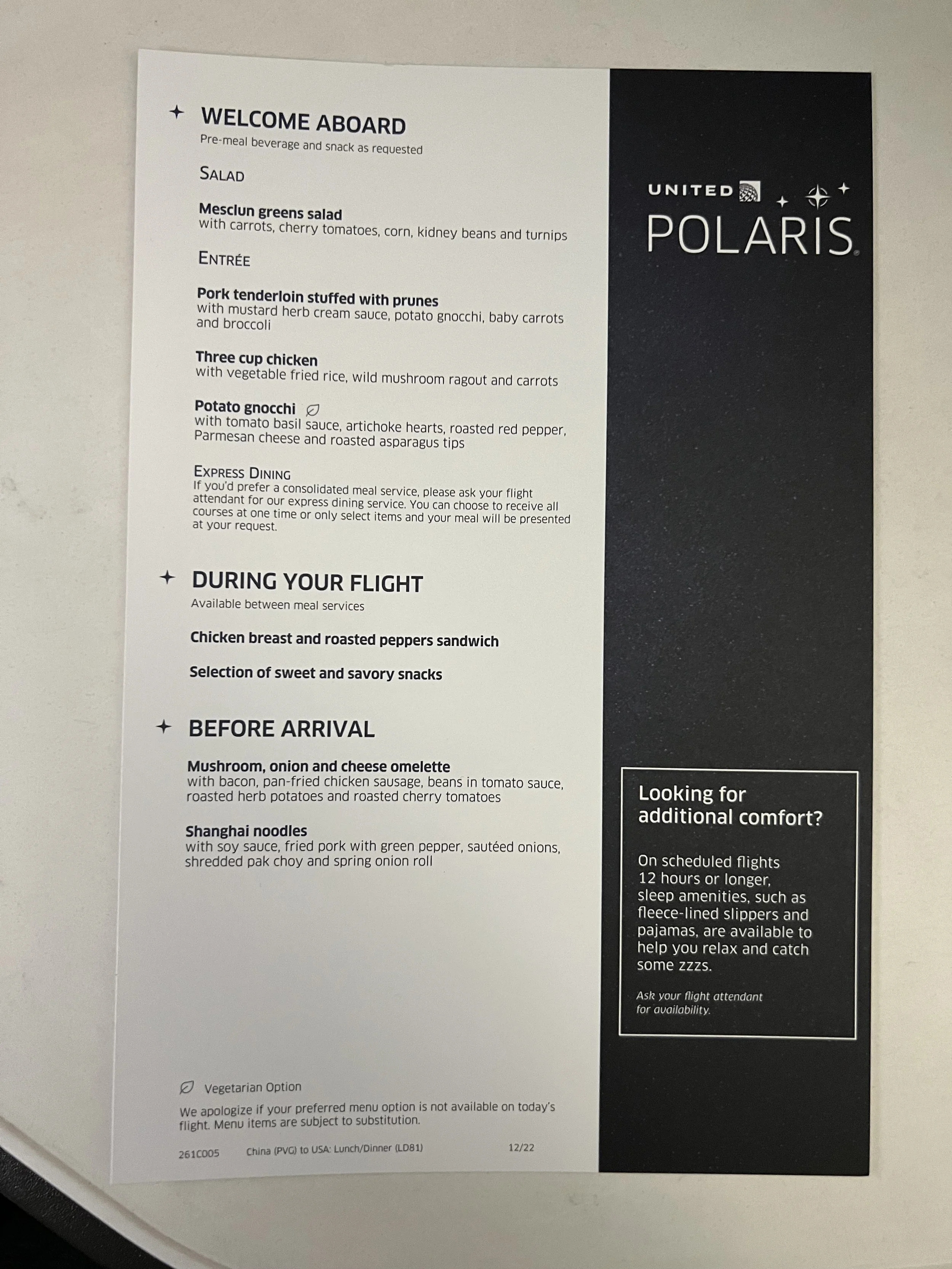 The catering on board today’s Shanghai PVG-SFO flight was IDENTICAL to the flight I took in December 2021, except on that flight we didn’t have paper menus, and the flight attendant thoughtfully took pictures of all of the entrees and showed them to us on his phone, so we could make an easier decision.