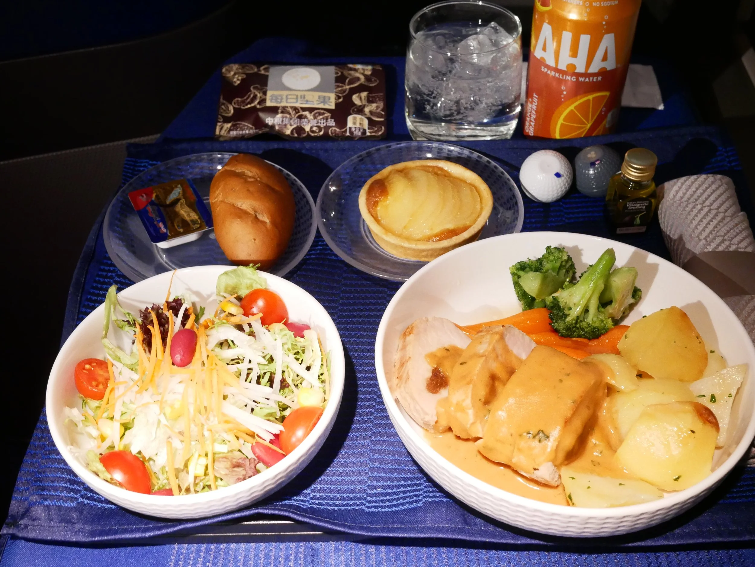 Then after takeoff from ICN, we got the main meal service, along with a beverage and another package of nuts and dried fruit. The salad was a regular garden salad with a few kidney beans.
