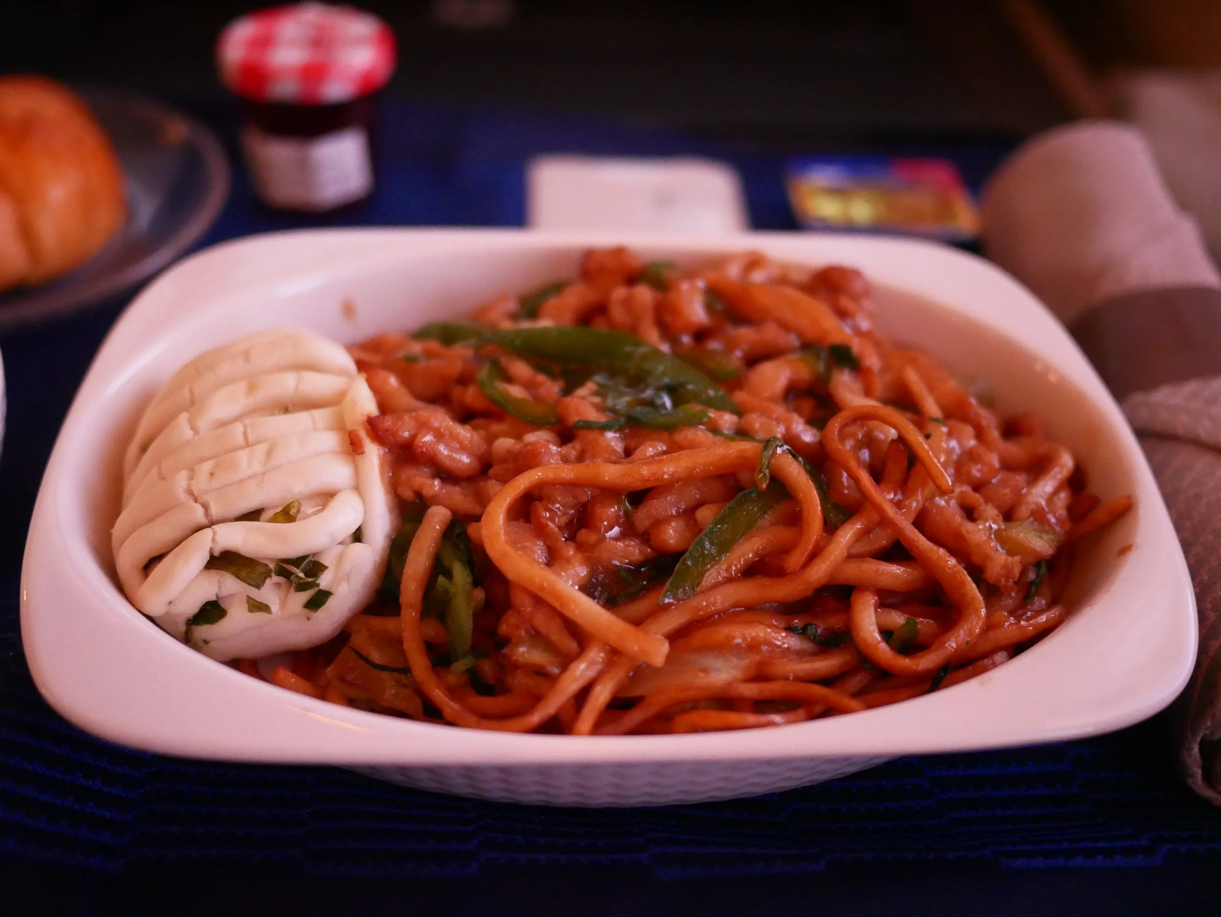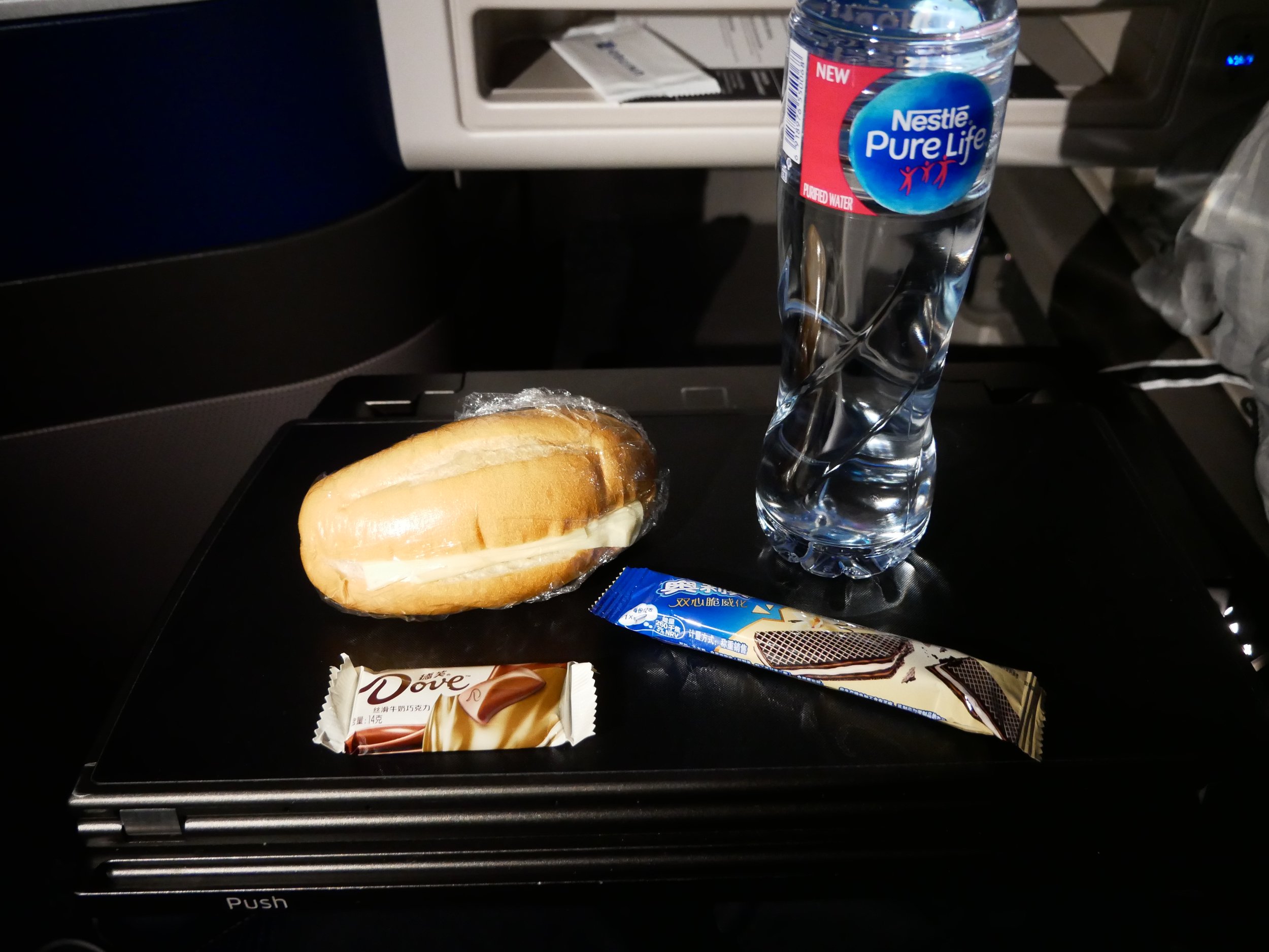 Last year, when I flew PVG-SFO, the flight attendants switched the meal order, serving the smaller meal first, and the bigger meal prior to landing. This actually made sense in a way, because we don’t get served a meal until around 1:30am, so maybe some people are getting ready for sleep right away. On that flight, I chose the omelette over the “Shanghai noodles,” and I remember the omelette to be fine, but I really disliked the sausage, and the beans were quite hard (undercooked). Last year, I already knew the Shanghai noodles were the same as my Economy class meal from my PVG-SFO flight in 2019, because I had seen the flight attendant’s pictures, but I figured that as I was faced with the lackluster Western breakfast, and for kicks and giggles, I’d order the Shanghai noodles. Just as I remembered from Economy class in 2019, the noodles were too soft. They came with a kind of dried out (based on the cracked surface) steamed scallion bun.