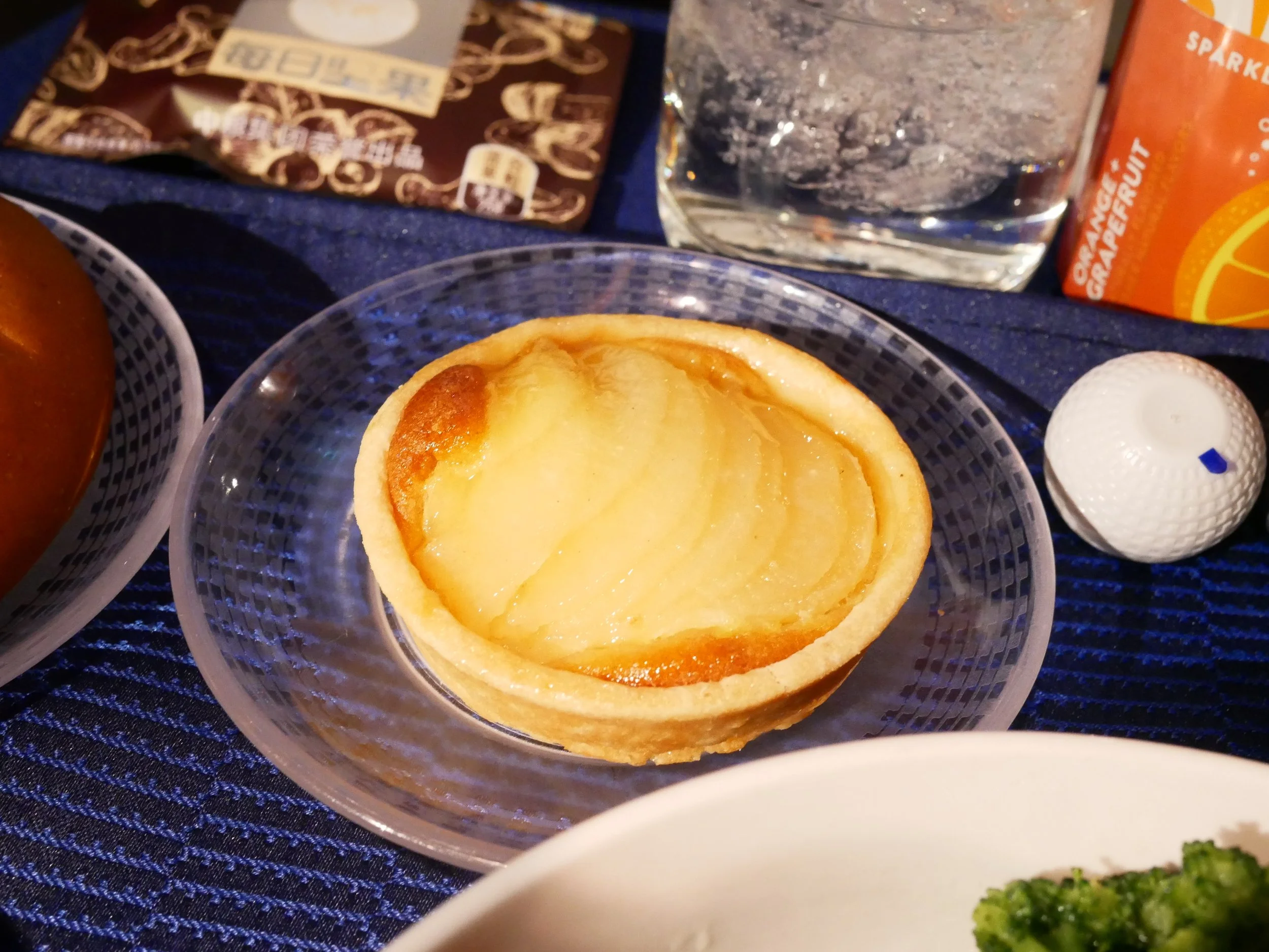 One difference from last year was the dessert. Last year we had a hunk of kind of bland chocolate cake in a bag. This year we had a plated pear tart. The pear was on a bed of almond paste. Delicious!