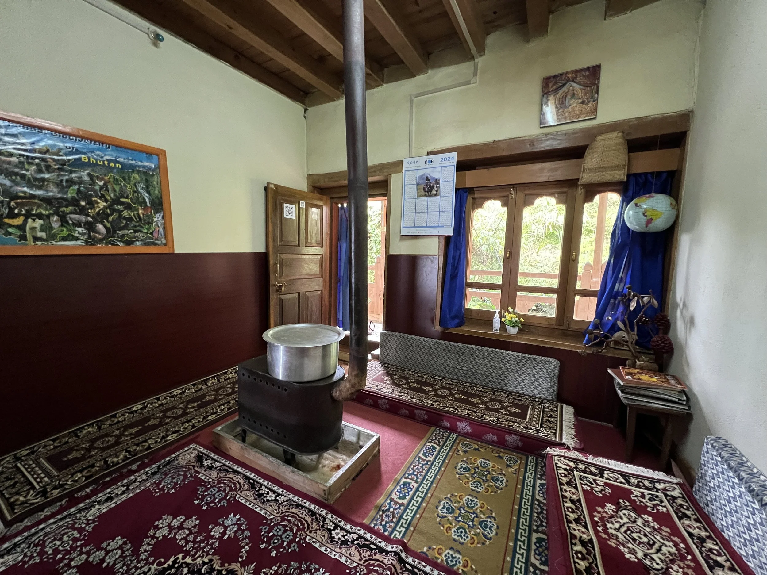 Here is that sitting area where we ate dinner last night. There’s a stove in the middle, and on top of the stove was a pot, which they fill with water in the wintertime, to both heat the water and also to humidify the room.